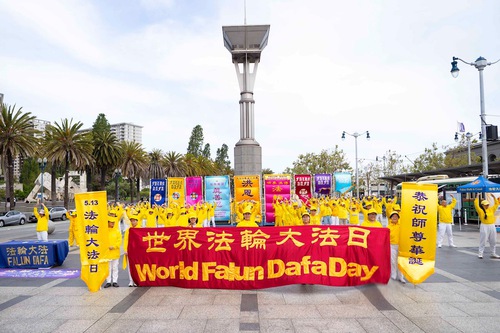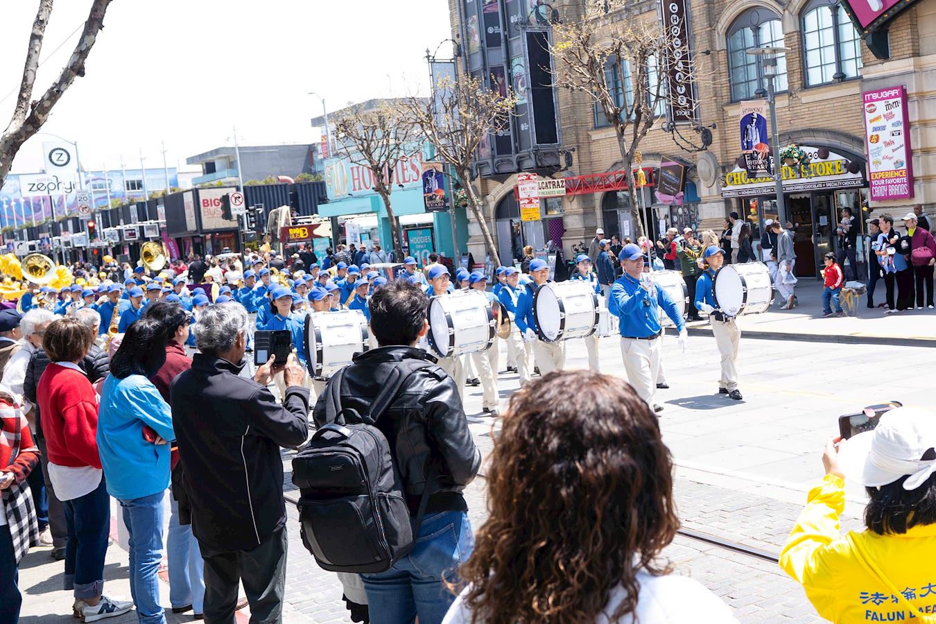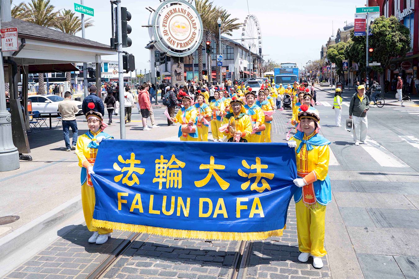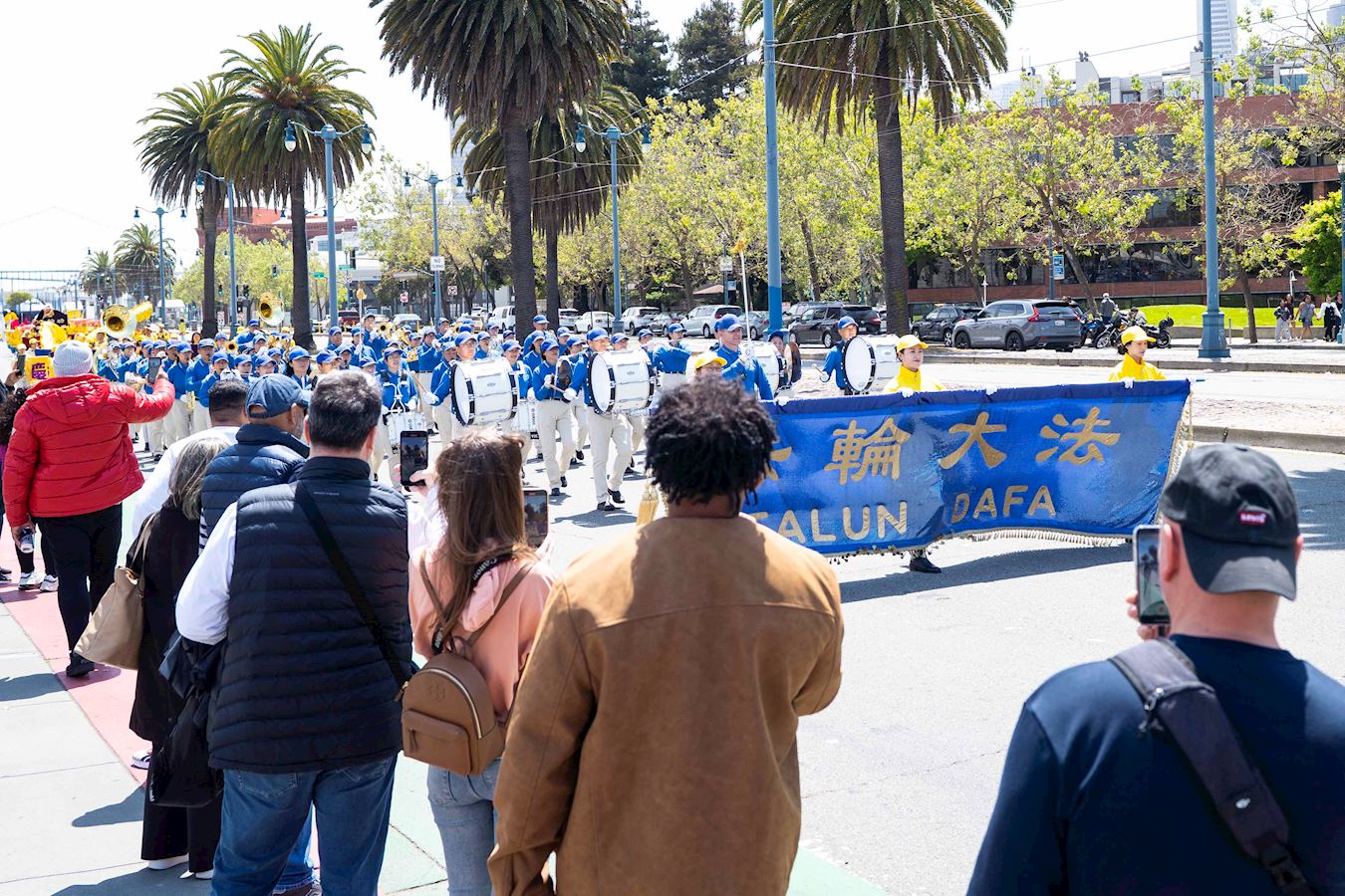 (Minghui.org) Practitioners held a grand parade in San Francisco on Saturday, May 3, 2025, to celebrate the 33rd anniversary of Falun Dafa’s public introduction and the birthday of its founder, Mr. Li Hongzhi. It was also an opportunity to share the principles of the practice—Truthfulness-Compassion-Forbearance—with the people of San Francisco and tourists from around the world.