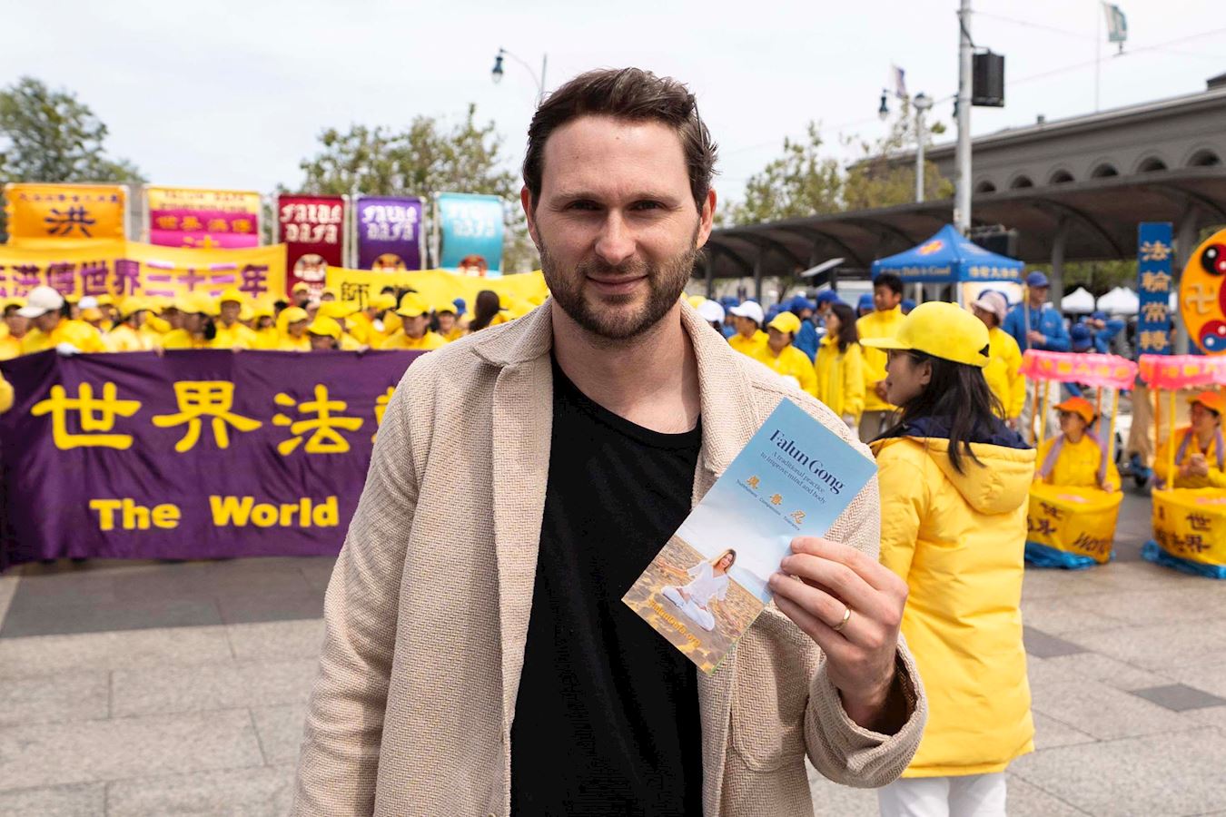 Caleb, who lives in San Francisco, said he was surprised to see so many people. After he was told that practitioners were celebrating the 33rd anniversary of the public introduction of Falun Dafa, he said, “It’s beautiful. Congratulations! I think Truthfulness-Compassion-Forbearance is especially important.”