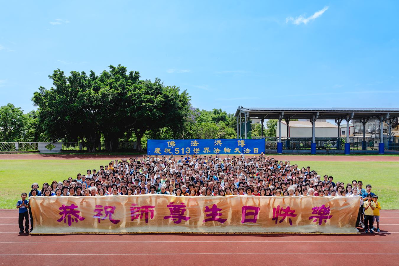 (Minghui.org) Practitioners celebrated the upcoming World Falun Dafa Day, which falls on May 13 every year, on May 4, 2025. This is the 33rd anniversary of when Falun Dafa was first taught in public in China. May 13 is also the birthday of Mr. Li Hongzhi, the founder of Falun Dafa. At Chyau Zhong Elementary School in Taichung City, practitioners lined up behind a banner that said “Wishing Revered Master a Happy Birthday.” They pressed their palms together in a gesture of respect and had a photo and video taken to wish Master Li a happy birthday.