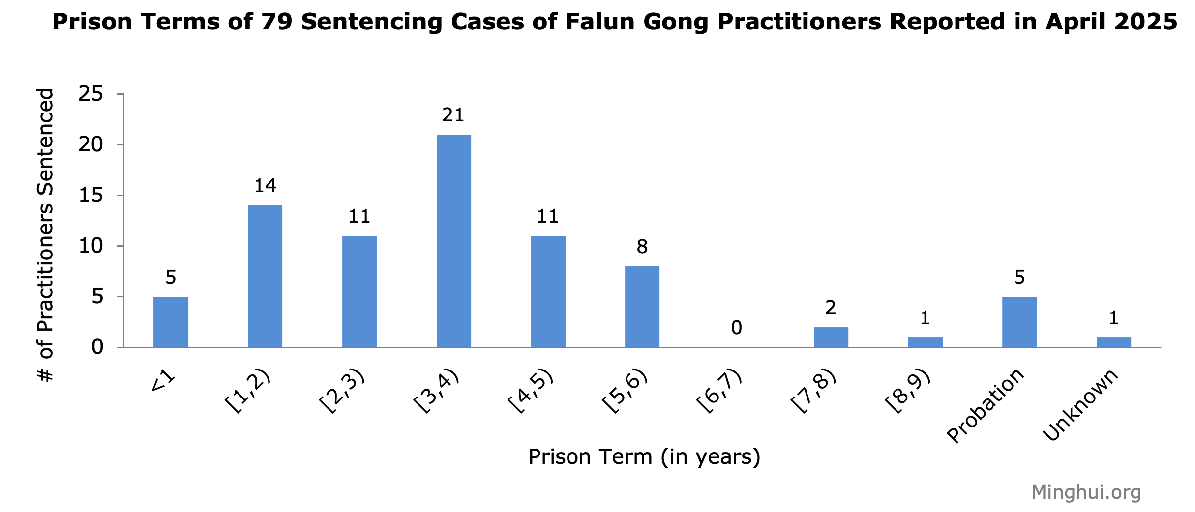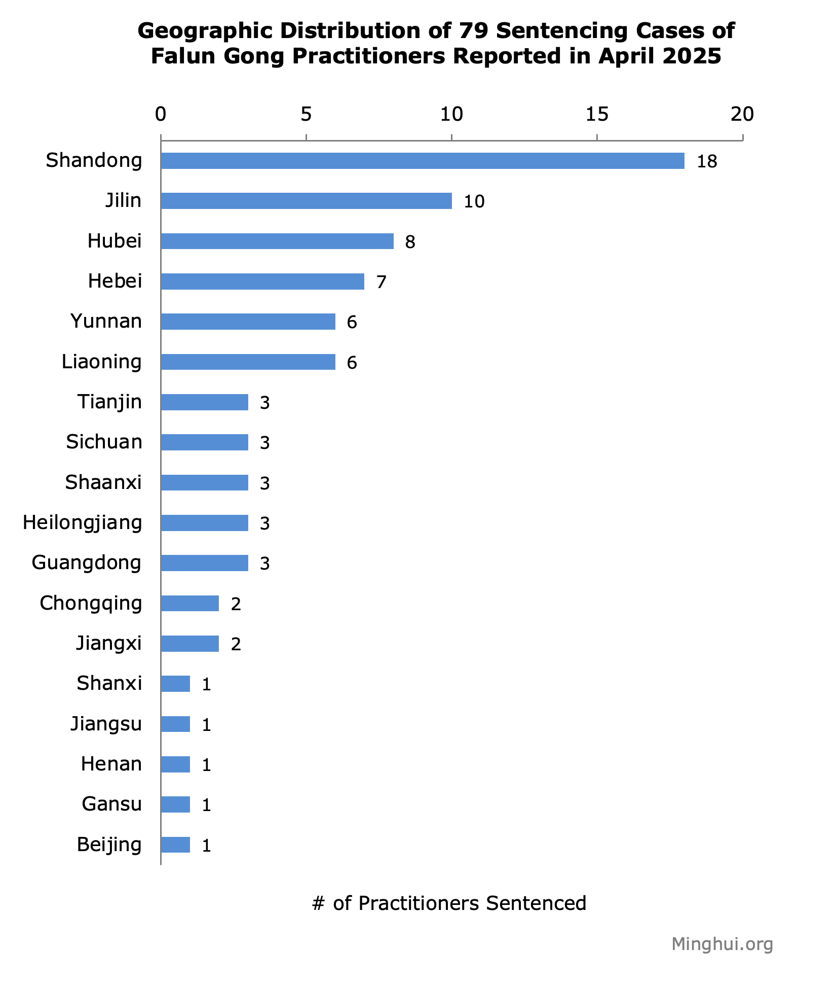 (Minghui.org) A total of 79 cases of Falun Gong practitioners sentenced to prison for their faith were confirmed in April 2025.