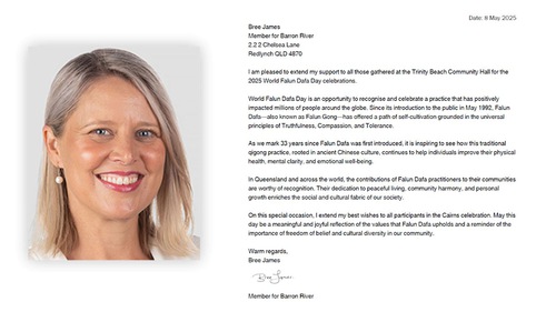 Ms. Bree James, Member of the Queensland Legislative Assembly for Barron River, stated in her letter, “World Falun Dafa Day is an opportunity to recognise and celebrate a practice that has positively impacted millions of people around the globe. Since its introduction to the public in May 1992, Falun Dafa—also known as Falun Gong—has offered a path of self-cultivation grounded in the universal principles of Truthfulness, Compassion, and Tolerance.