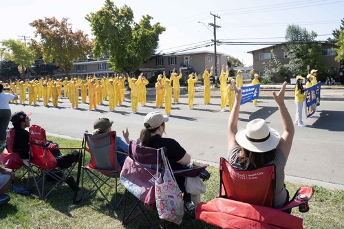 The Falun Gong parade entry included large banners and practitioners in yellow exercise suits demonstrating the exercises. Many people followed along with their movements. After the parade, many expressed interest in learning more about Falun Gong and others asked where they could learn the exercises.