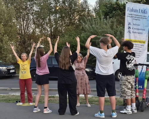 A group of young people learn the Falun Dafa exercises in Bucharest, Charles de Gaulle Square, at the entrance to King Michael I Park, on August 30.