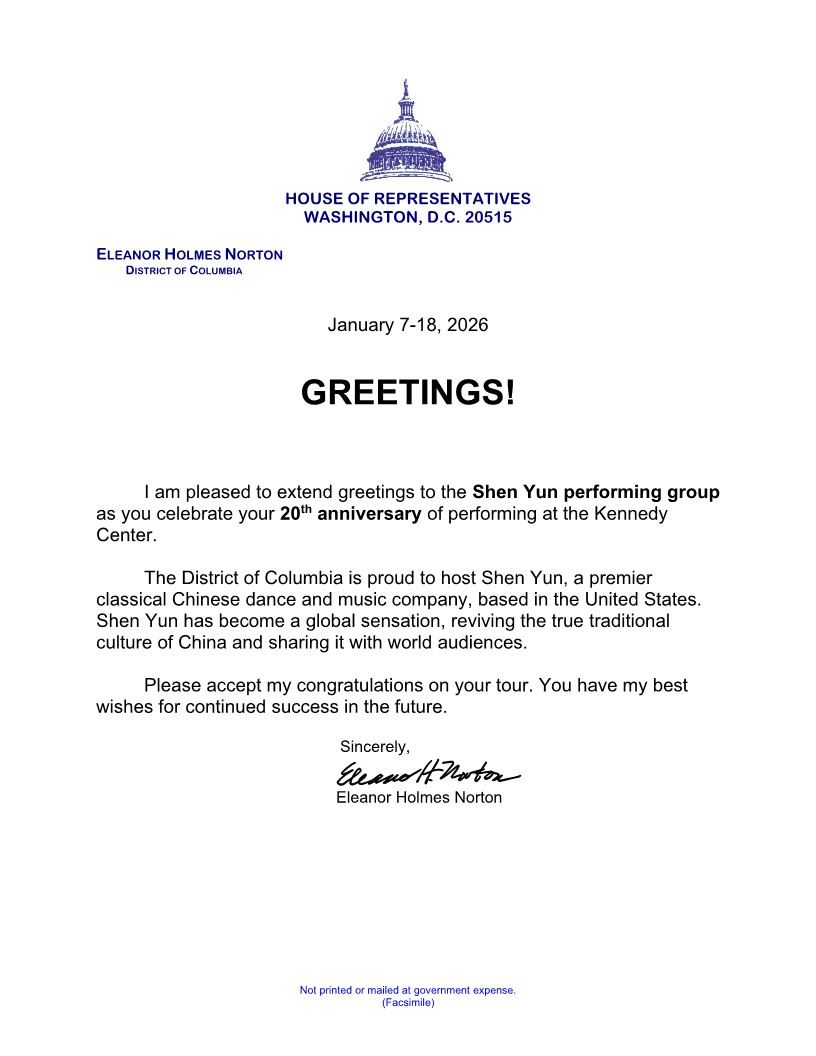 (Minghui.org) Congresswoman Eleanor Holmes Norton sent greetings to Shen Yun Performing Arts as the company began its 20th anniversary tour with performances at the Kennedy Center from January 7 to 18, 2026. She wished the performing arts company continued success.