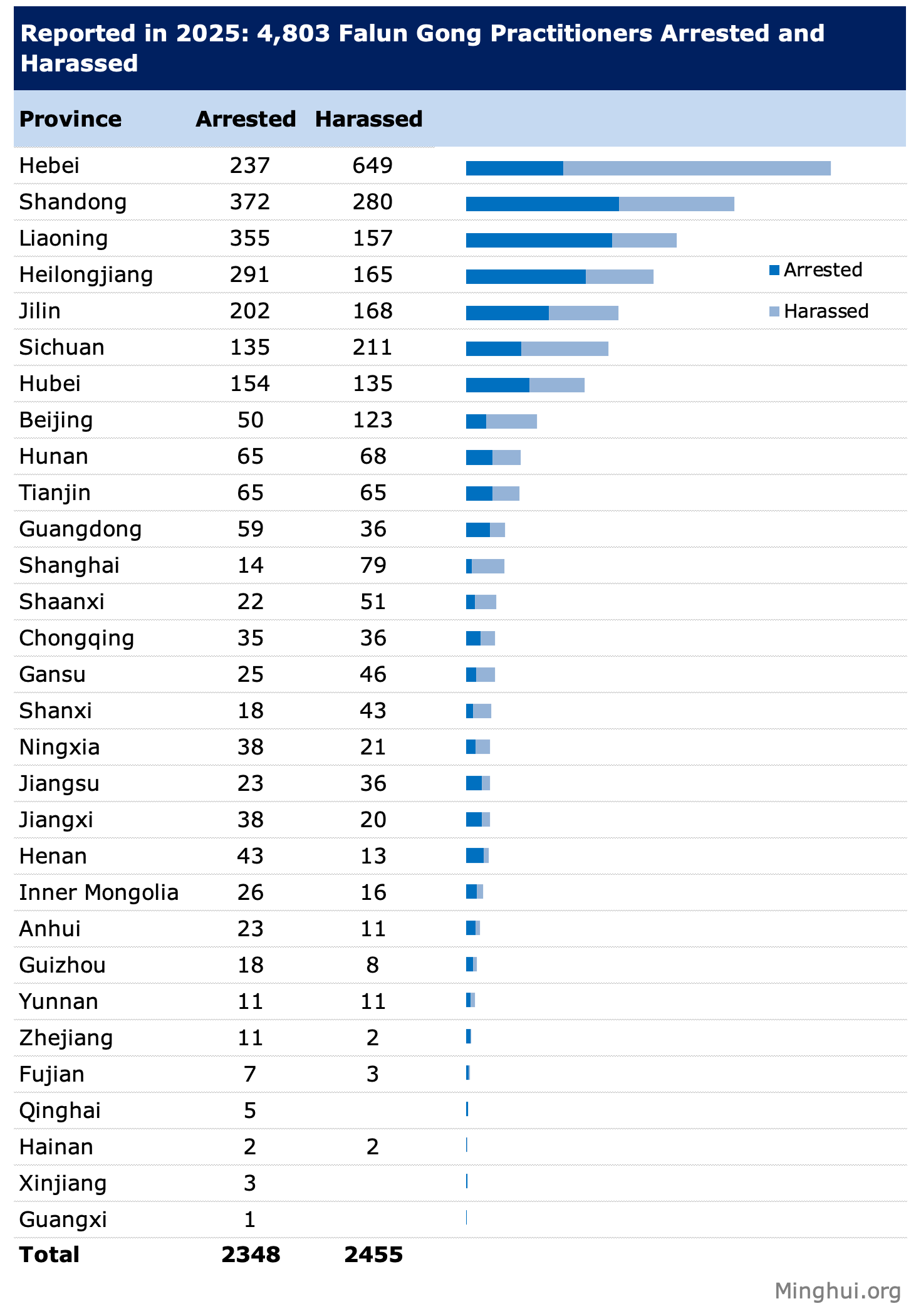 In particular, Hebei, a province encircling Beijing, reported the most cases, totaling 886 (arrests and harassment combined). The persecution in Shandong and Liaoning was also severe, with 652 and 512 cases reported, respectively. Seven other regions also registered three-digit numbers of cases, between 130 and 456. A total of sixteen regions had double-digit totals, ranging from 10 to 95. The remaining four regions registered cases in the single digits, between 1 and 5.
