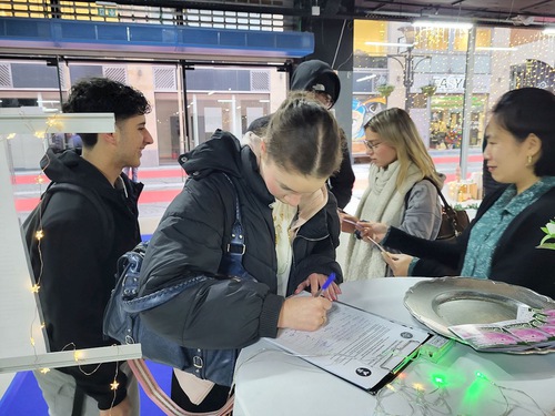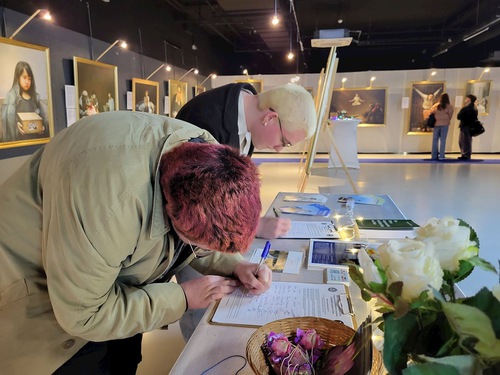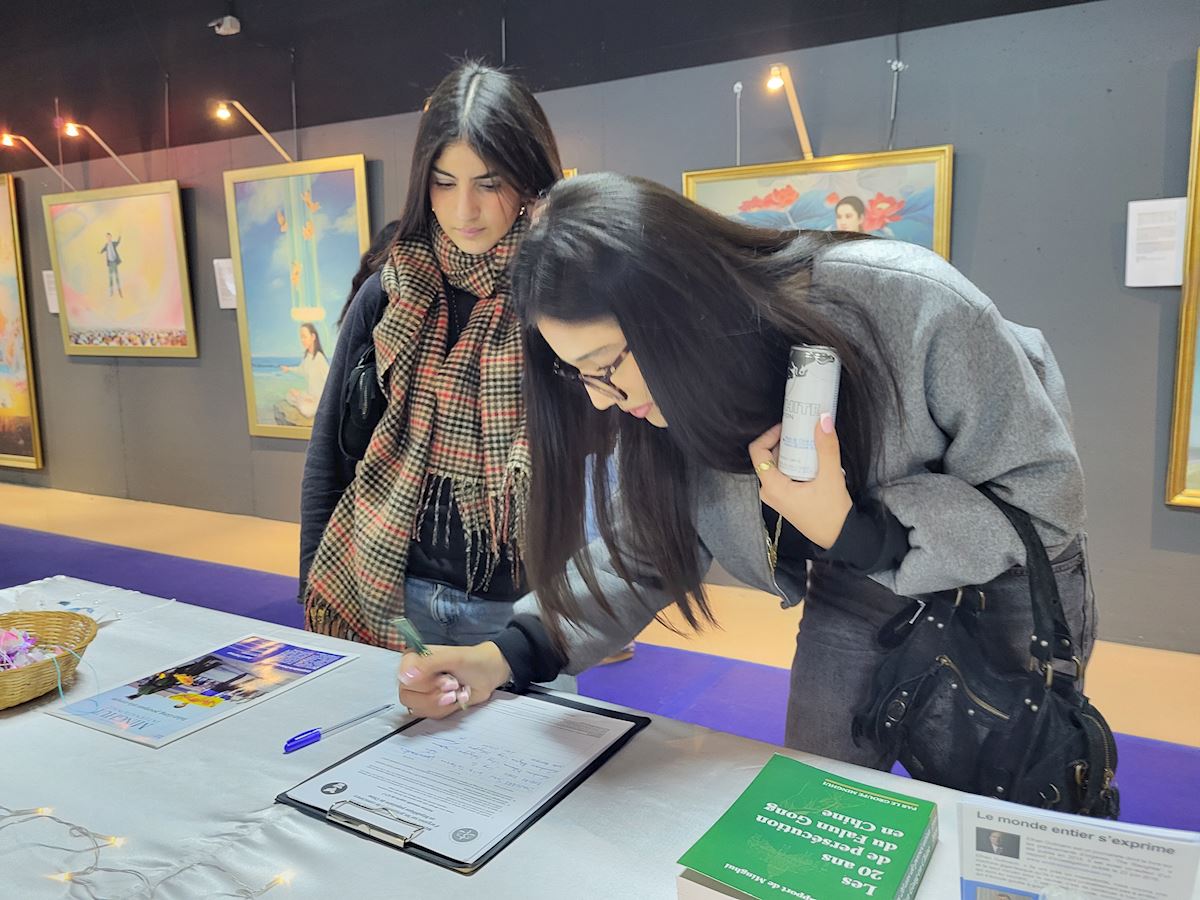 Visitors sign the petition to demand that Beijing end the persecution of Falun Gong.