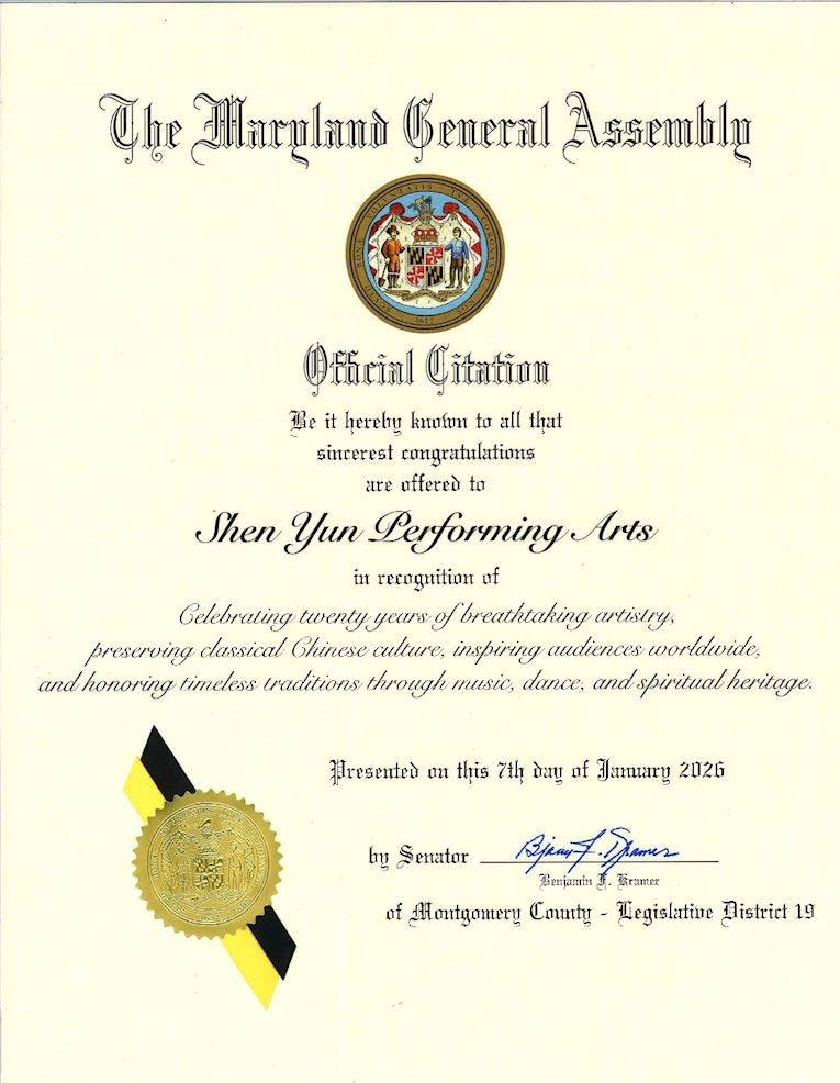 (Minghui.org) Benjamin Kramer, Senator of the Maryland General Assembly, issued an official citation on January 7, 2026, to congratulate Shen Yun Performing Arts.