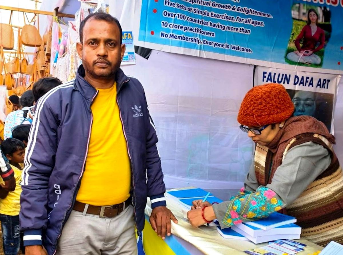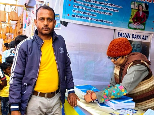 Chatraparti Murmu is a biology teacher who had a long conversation about the practice with a practitioner at the booth. He said he understood that practicing Falun Dafa helps one develop positive thoughts and reduce negative ones. He said that he discovered something, “That will give me a new direction in life” and purchased both Zhuan Falun and Falun Gong.