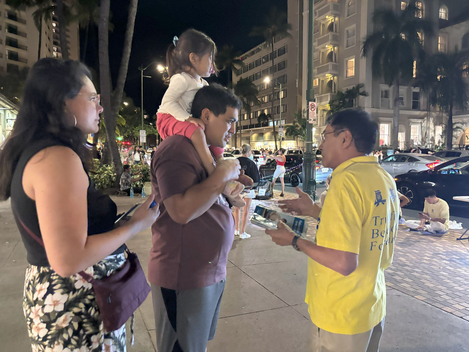 After Qing began practicing Falun Dafa in 2003 she’s become healthy and energetic. She often comes to the booth in Waikiki to clarify the truth to people and hands out flyers. One day she saw a man kneel down in front of the posters when he saw the pictures of the torture and organ harvesting. He kept wiping his tears. Qing was very touched.