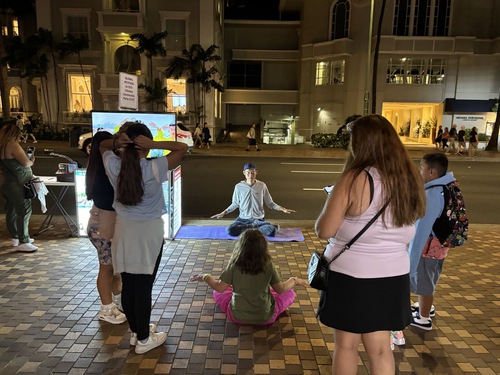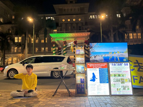(Minghui.org) The practitioners from a truth-clarification site in Hawaii gathered on Kalakaua Avenue in Waikiki on the evening of December 27, 2025 to wish Master Li a Happy New Year. They expressed their gratitude to Master Li for teaching them the principles of Truthfulness-Compassion-Forbearance and guiding them to walk on a path to return to their true selves. As the New Year is just around the corner, they wished Master Li a Happy New Year and express their immense gratitude to him for his compassionate saving grace. They exclaimed, “We wish Master a Happy New Year! Falun Dafa is good! Truthfulness-Compassion-Forbearance is good!”
