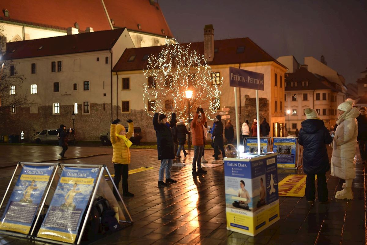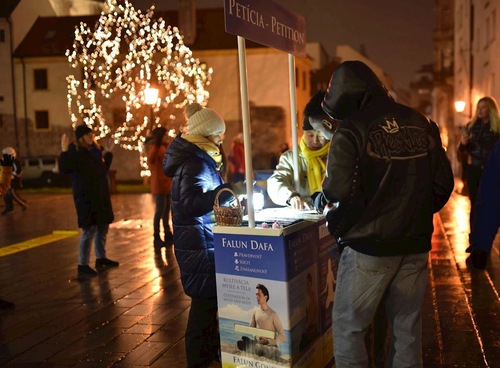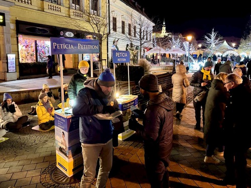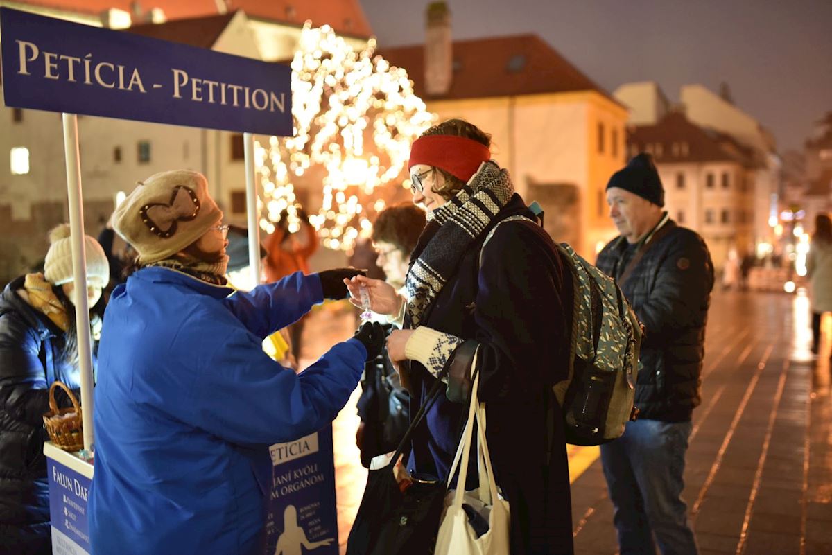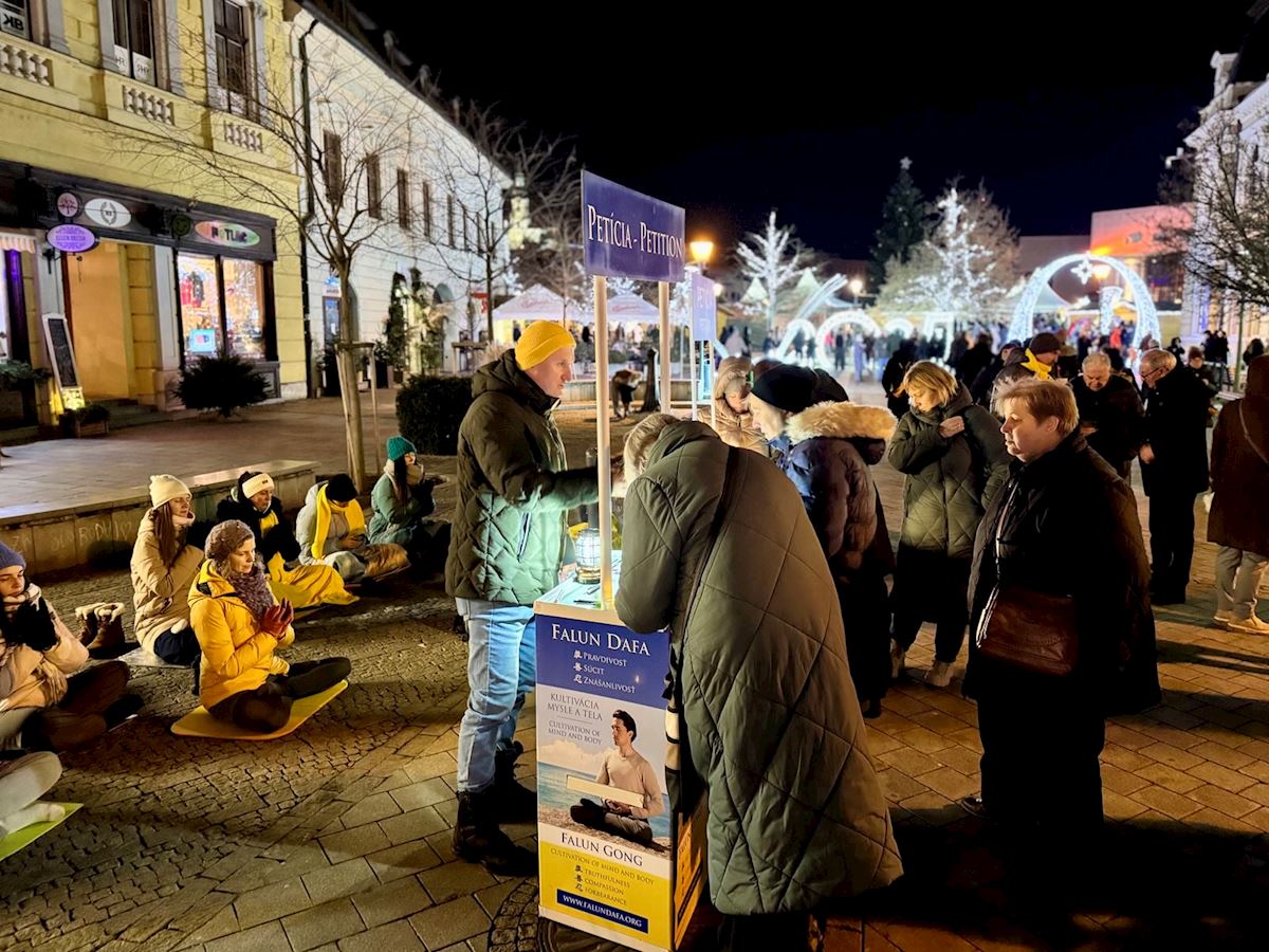 Falun Dafa practitioners told people about the brutal persecution in China and collected signatures on a petition during the event in Bratislava on December 21, 2025.