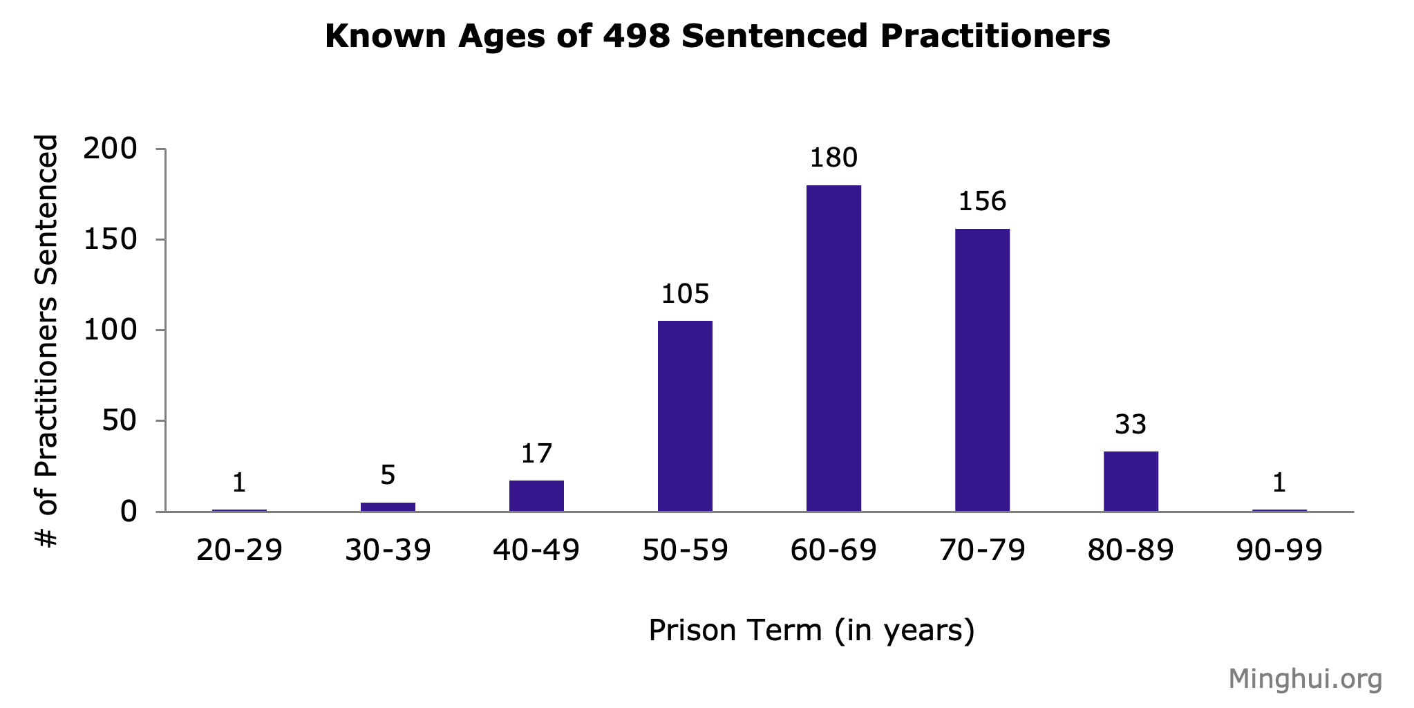 Among 498 out of the 751 practitioners whose ages at the time of their sentencing were known, 1 was in her 20s, 5 in their 30s, 17 in their 40s, 105 in their 50s, 180 in their 60s, 156 in their 70s, 33 in their 80s, and 1 in her 90s.