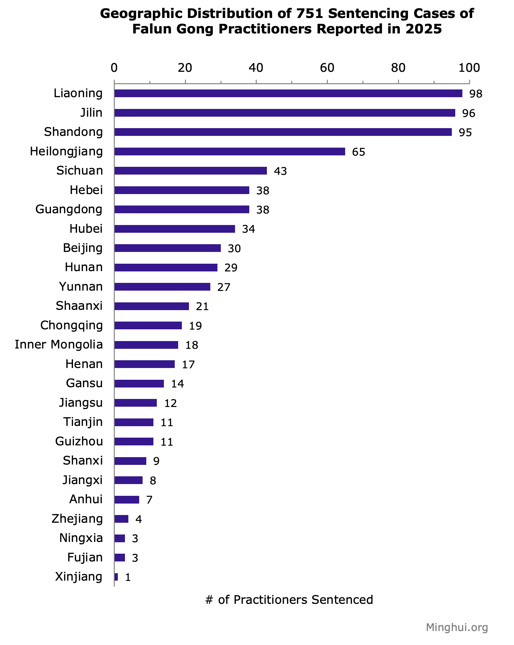 Among the 751 newly reported sentencing cases, 514 took place in 2025 and 237 practitioners were sentenced in earlier years. The delay in reporting was caused by the CCP’s strict information censorship, which aims to conceal the persecution of Falun Gong to avoid international scrutiny.
