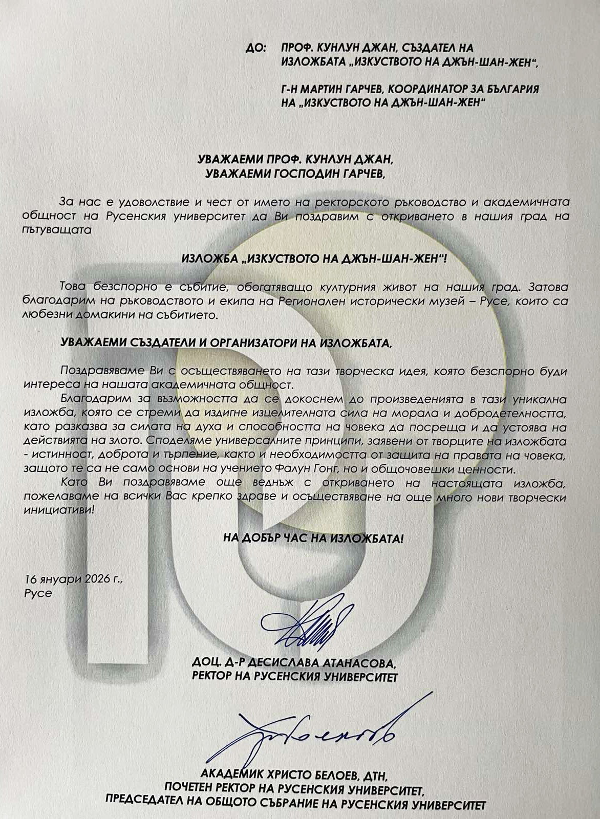 Assoc. Prof. Ivanova was a special envoy of Assoc. Prof. Desislava Atanasova, Rector of Angel Kanchev University of Ruse, and of the Honorary Rector, Academician Hristo Beloev, PhD. She presented a congratulatory address to the coordinator of The Art of Zhen-Shan-Zhen exhibition on Prof. Atanasova’s behalf.