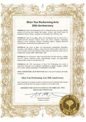 “WHEREAS, the 20th Anniversary of Shen Yun Performing Arts marks a significant milestone in its enduring commitment to artistic integrity, cultural preservation, and the enrichment of communities worldwide;