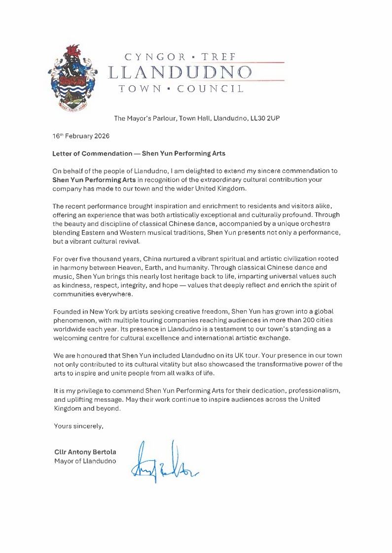 Two days later, he wrote a letter to the hosting organization in appreciation of the show’s great contribution. “For over five thousand years, China nurtured a vibrant spiritual and artistic civilization rooted in harmony between Heaven, Earth, and humanity. Through classical Chinese dance and music, Shen Yun brings this nearly lost heritage back to life, imparting universal values such as kindness, respect, integrity, and hope—values that deeply reflect and enrich the spirit of communities everywhere,” Mayor Bertola wrote.