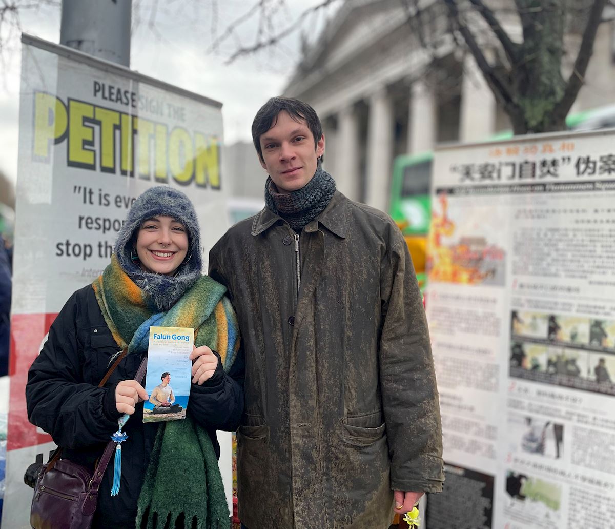 People stopped to watch practitioners do the exercises, and many signed the petition that calls to end the persecution. Irene and her friend Rowan from the Netherlands paused to learn more about Falun Dafa. “I like Truthfulness-Compassion-Forbearance, because these are core values that everyone should follow,” said Irene. Rowan agreed.