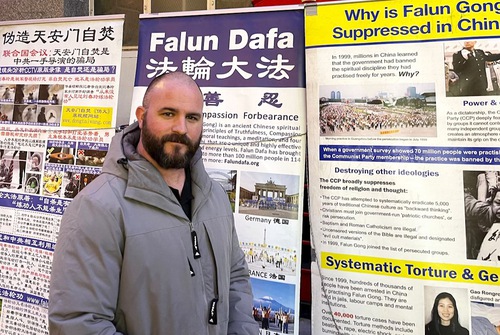 Many people stopped to read the information on the practitioners’ posters and signed the petition, and Jamie was one of them. Jamie worked as a security guard and said his step-mother came from Hong Kong, so every year his family celebrates Chinese New Year.