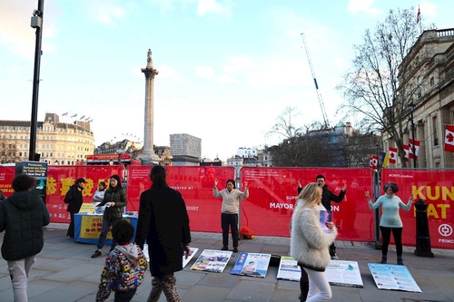 Practitioners introduced Falun Dafa during the Chinese New Year celebrations in central London. Local residents and tourists watched practitioners demonstrate the exercises and learned about the ongoing persecution in China.