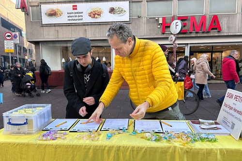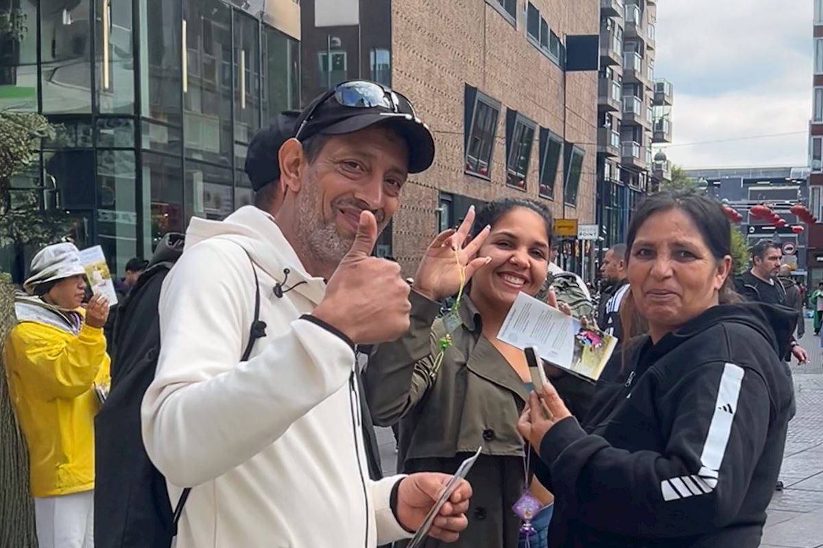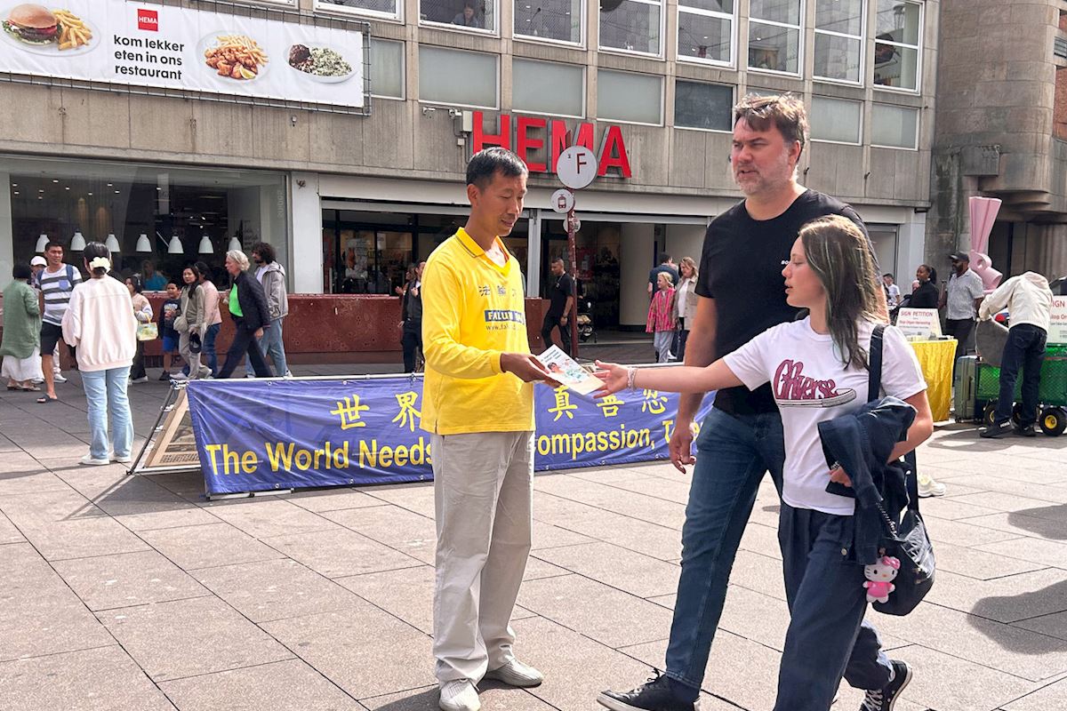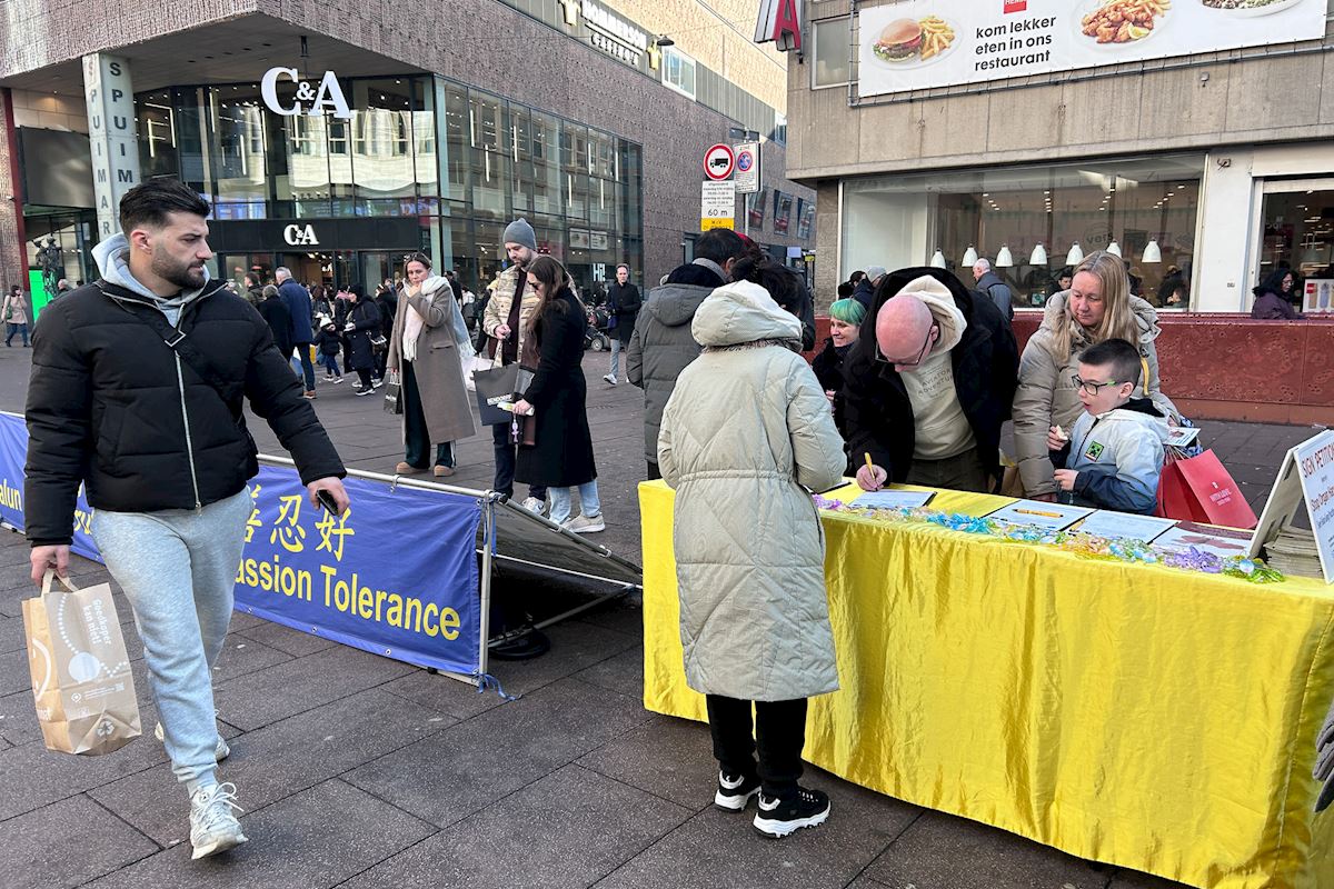 Practitioners in the Netherlands hold regular events on Grote Markststraat, a commercial street in the center of The Hague. They demonstrate the five exercises, hand out flyers, and talk to people. Business people, scholars, international students, human rights workers, and international tourists stop to learn about Falun Dafa and the CCP’s ongoing persecution. Many who hear about the persecution for the first time are stunned. Others who already know about the situation express their support and admiration for the practitioners.