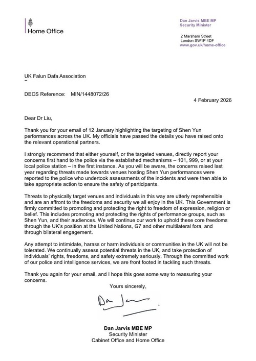 (Minghui.org) In a letter to the UK Falun Dafa Association dated February 4, 2026, UK Security Minister Dan Jarvis wrote: “Threats to physically target venues and individuals in this way are utterly reprehensible and are an affront to the freedoms and security we all enjoy in the UK.”