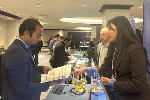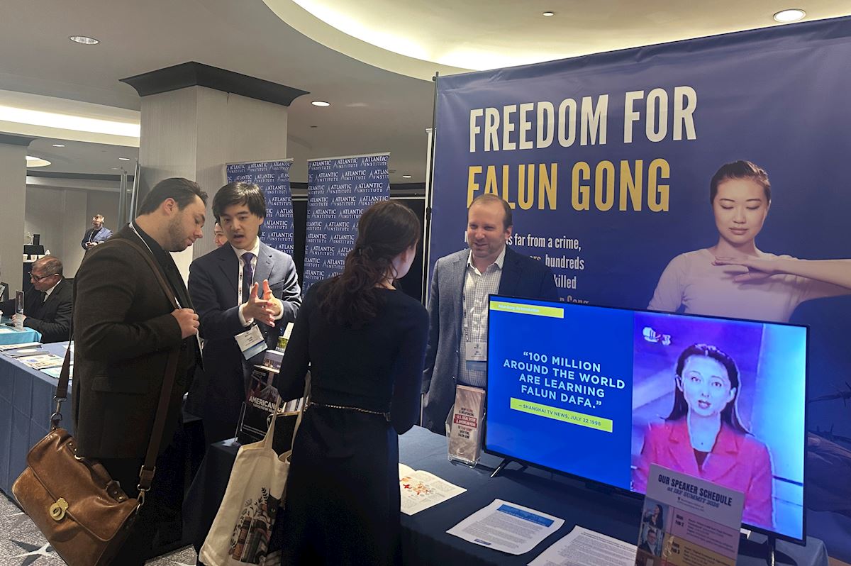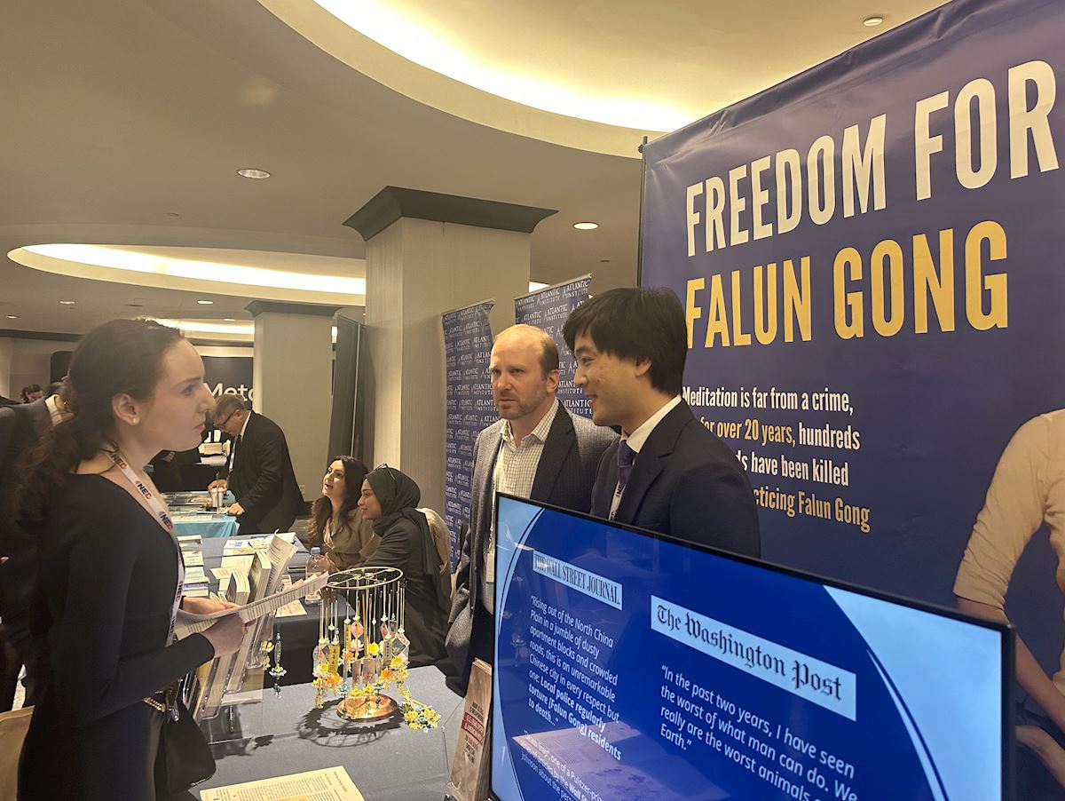 Practitioners set up a stand at the Hilton Hotel and played videos to introduce Falun Dafa (Falun Gong) and tell people why the Chinese Communist Party (CCP) has brutally persecuted the practice for the past 26 years. Many conference attendees paused to learn about the issue. Some said that they did not know about the CCP’s persecution and that they appreciated the practitioners raising awareness about the persecution at the summit.