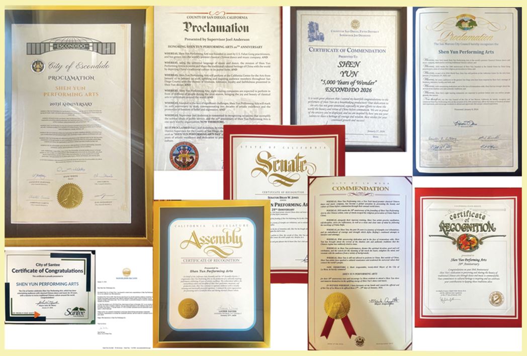 Through a certificate of commendation, County Supervisor Jim Desmond, “Extends heartfelt congratulations” to Shen Yun. “Your dedication to the arts has not gone unnoticed, especially in your efforts to show the world the beauty and virtue of China before communism. We are so proud of the artistry you’ve displayed, and we are inspired by how you use your talents to share a heritage of courage and wisdom.”