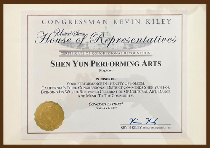 The certificate from Rep. Kevin Kiley reads, “California’s third Congressional district commends Shen Yun for bringing its world-renowned celebration of cultural art, dance and music to the community. Congratulations!”