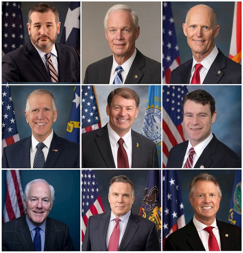 Senators who sponsored the Falun Gong Protection Act (S.817)(First row, from left to right): Sponsor Texas Republican Senator Ted Cruz, co-sponsors: Senators Ron Johnson (Wisconsin), Rick Scott (Florida);(Second row, left to right): Thom Tillis (North Carolina), Mike Rounds (South Dakota), Todd Young (Indiana);(Third row, left to right): John Cornyn (Texas), David McCormick (Pennsylvania) and Roger Marshall (Kansas).