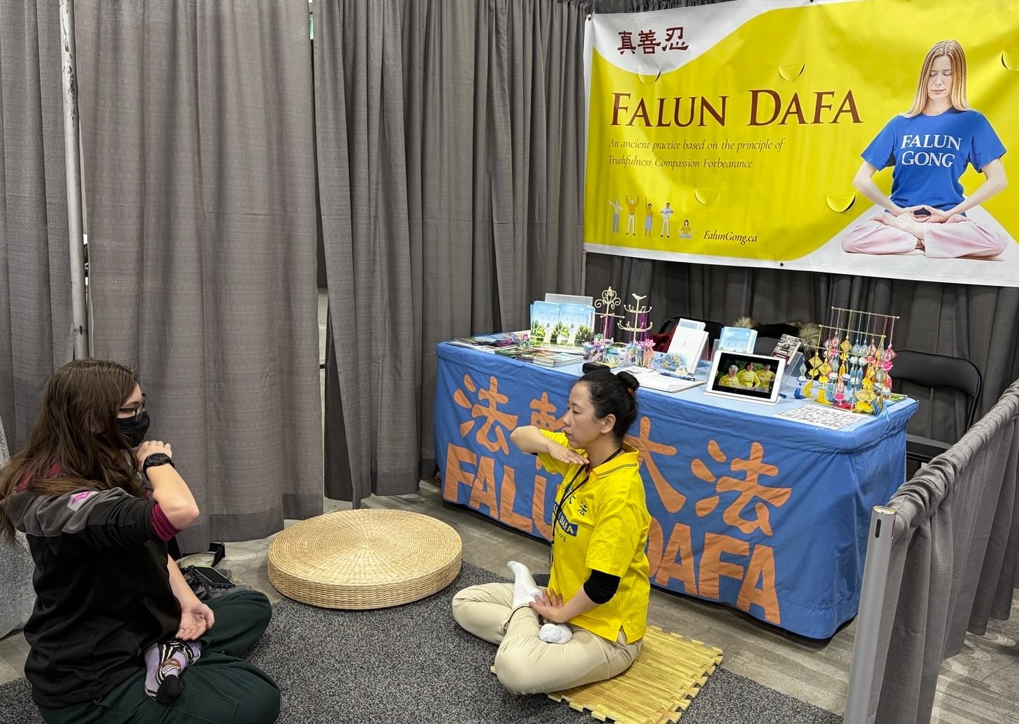 A visitor (left) learns the exercises while two visitors (right) talk with a practitioner about the merits of Falun Dafa.