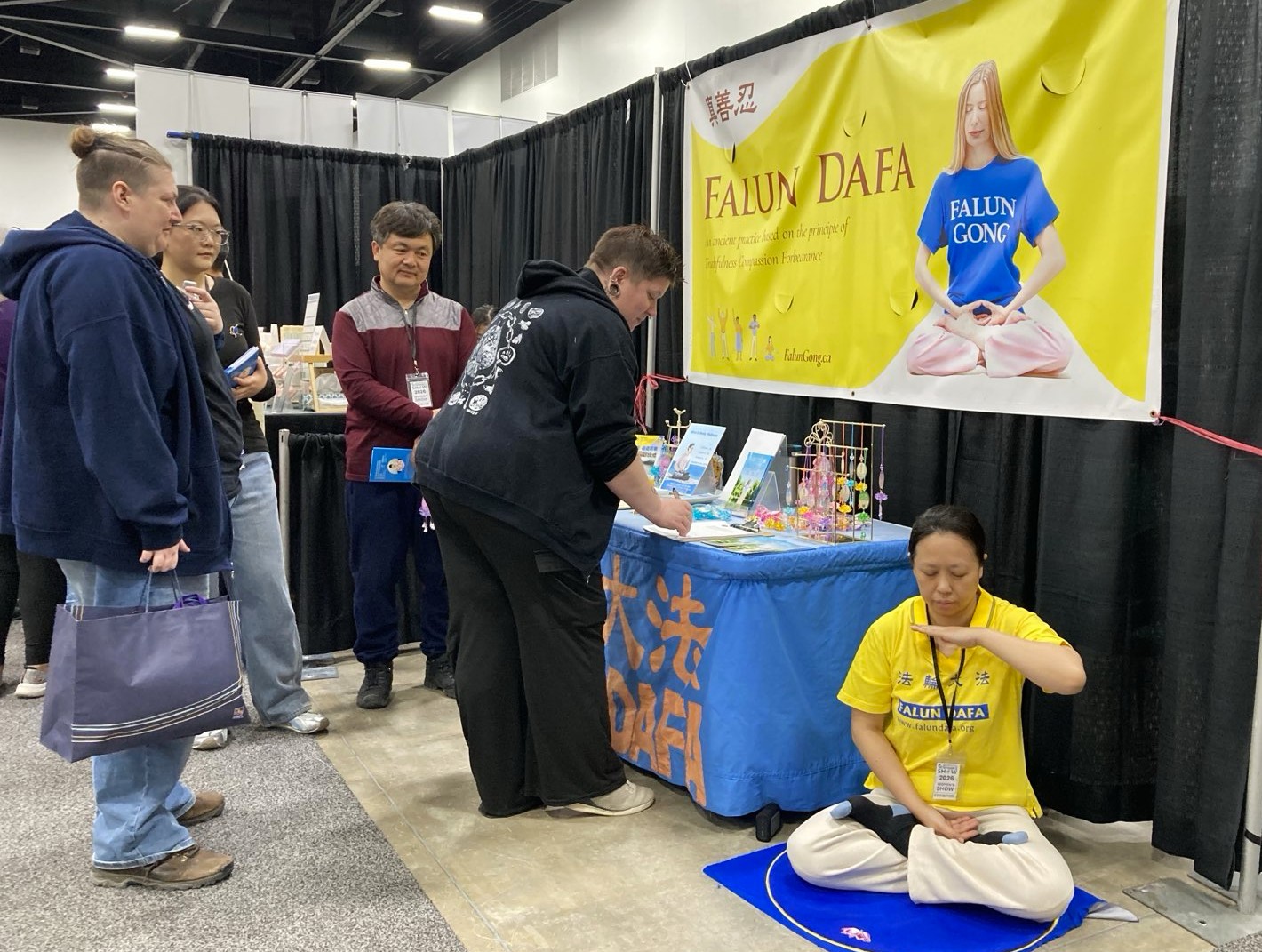Many people paused and quietly watched practitioners peacefully meditating despite the crowds and noise at the show. People were amazed that practitioners could sit so serenely and enter such a state of deep stillness.