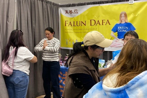 There was a steady stream of visitors at the Falun Dafa booth throughout the event. Practitioners told people about the merits of Falun Dafa, demonstrated the five exercises, and distributed flyers.