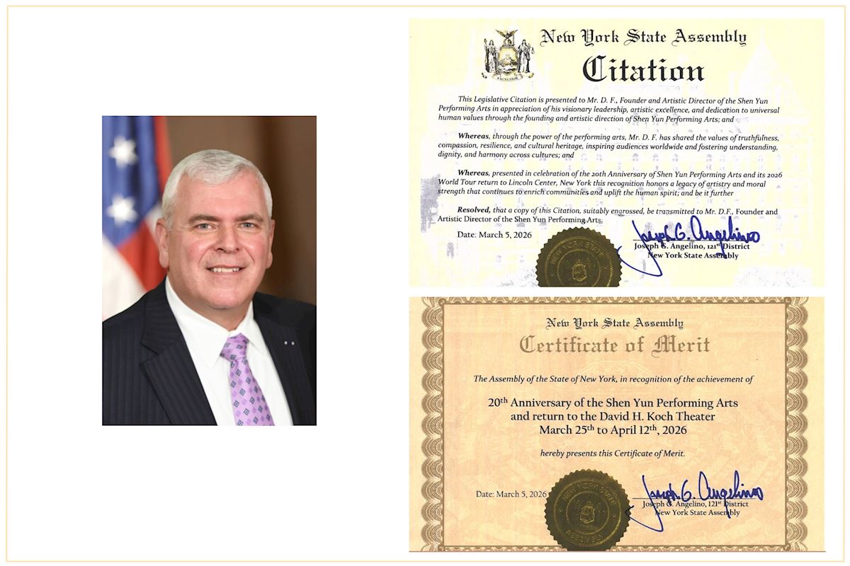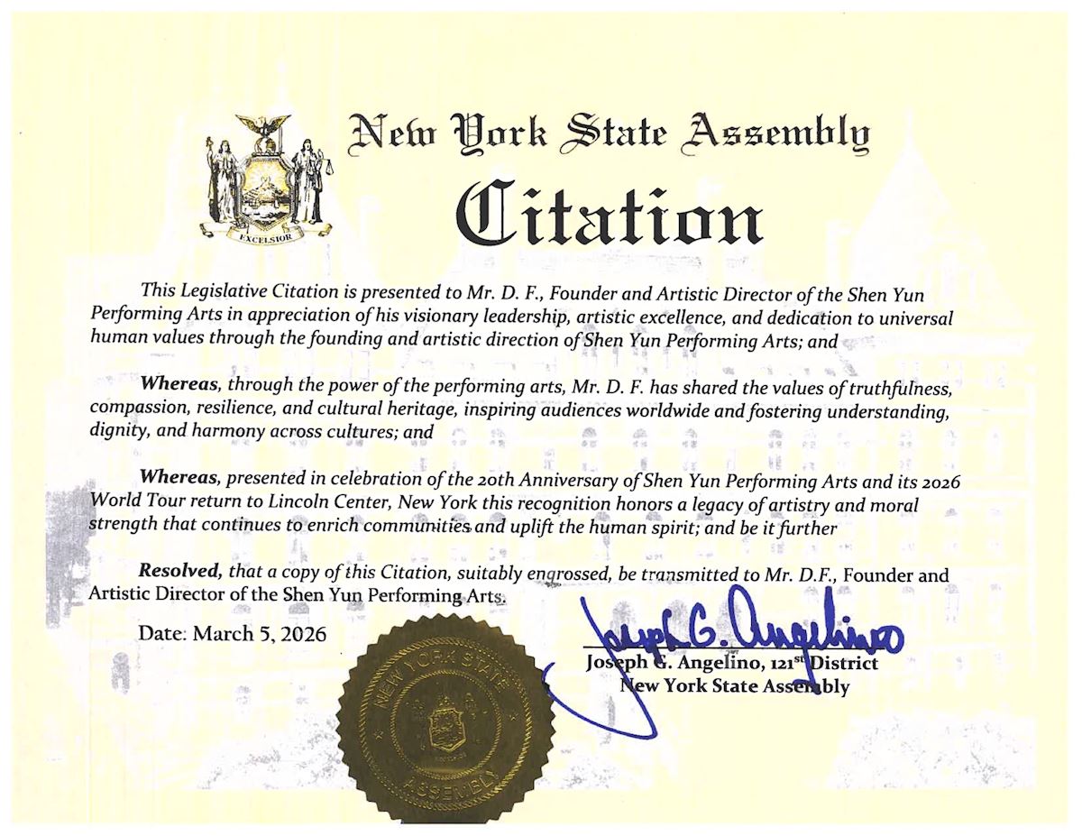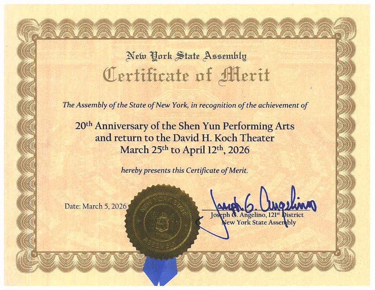 In the Certificate of Merit issued for Shen Yun, Assemblyman Angelino wrote, “The Assembly of the State of New York, in recognition of the achievement of 20th Anniversary of the Shen Yun Performing Arts and return to the David H. Koch Theater March 25th to April 12th, 2026, hereby presents this Certificate of Merit.”