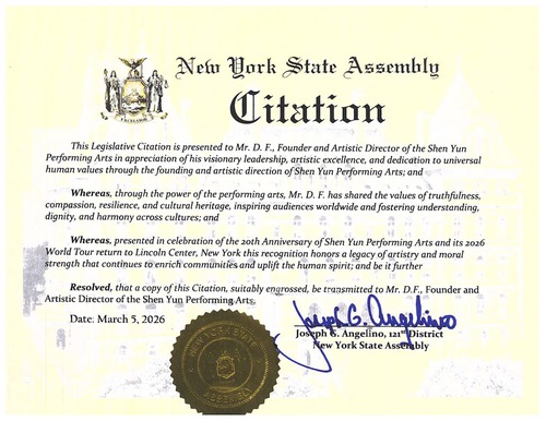 (Minghui.org) Shen Yun Performing Arts will return to the David H. Koch Theater in New York City from March 25-April 12, 2026, with new programs for the 2026 season. Joseph Angelino, a New York State Assembly Member, recently recognized Shen Yun with a legislative citation honoring Shen Yun’s Artistic Director, and a certificate of merit congratulating the performing arts company on its 20th anniversary and return to Lincoln Center.
