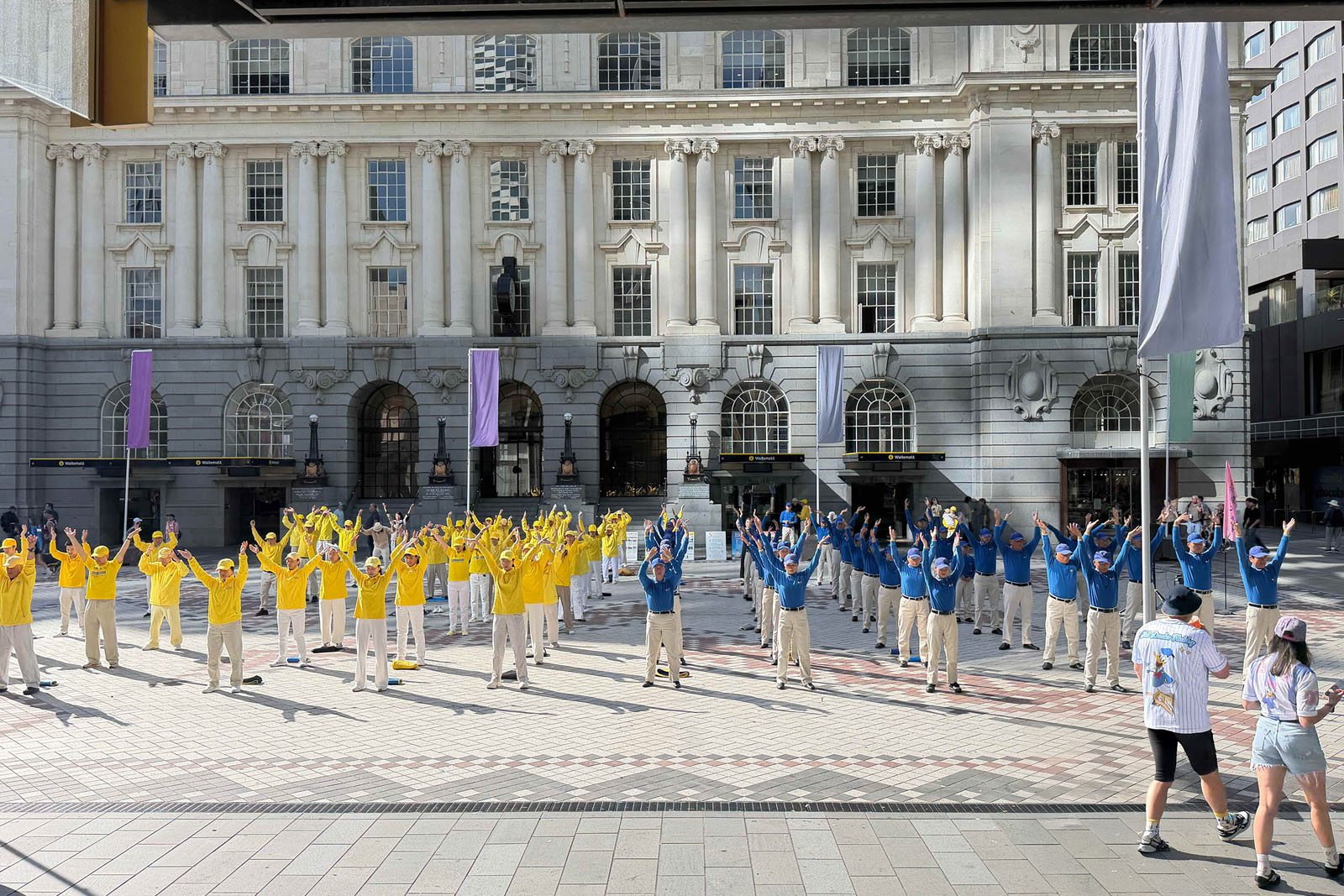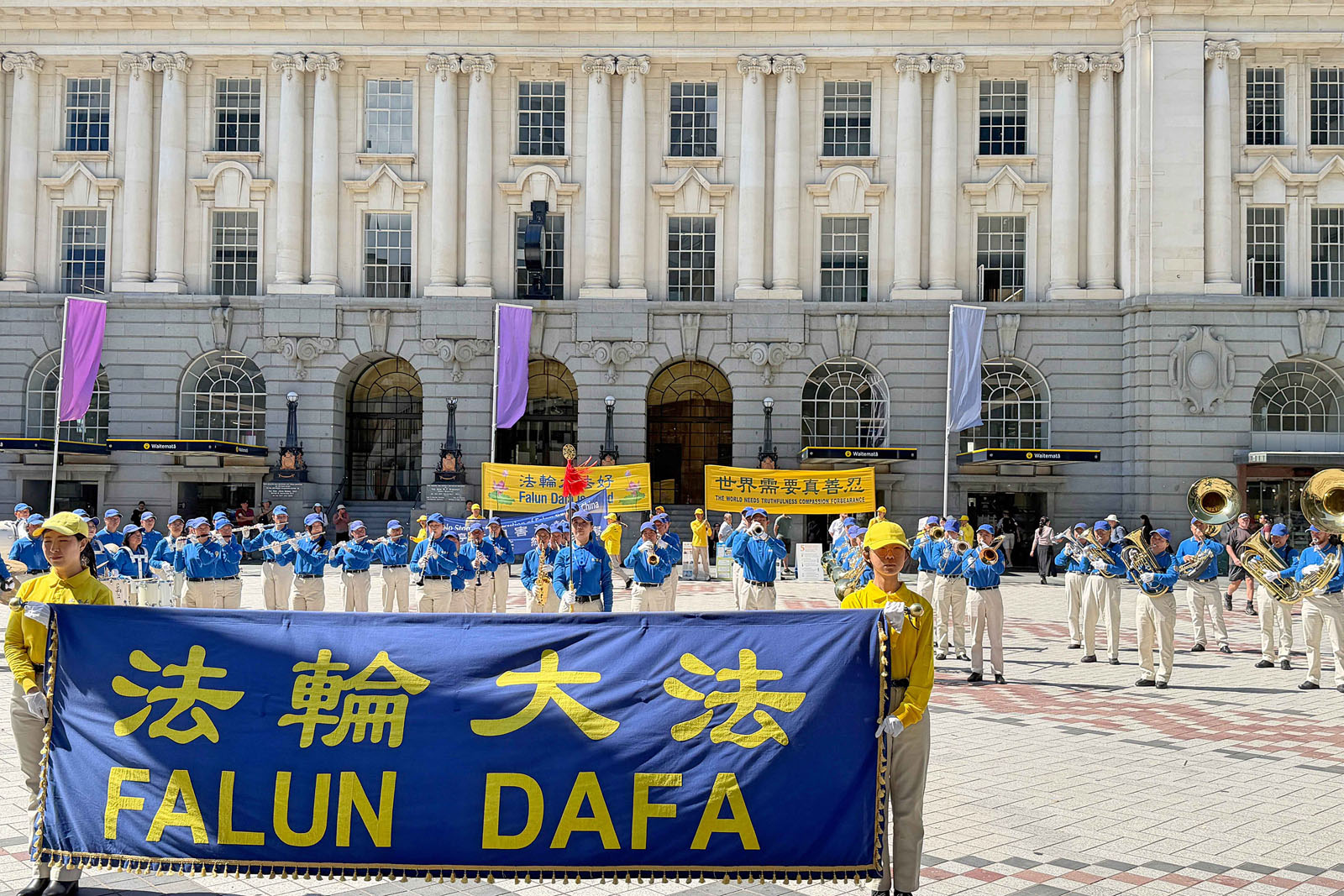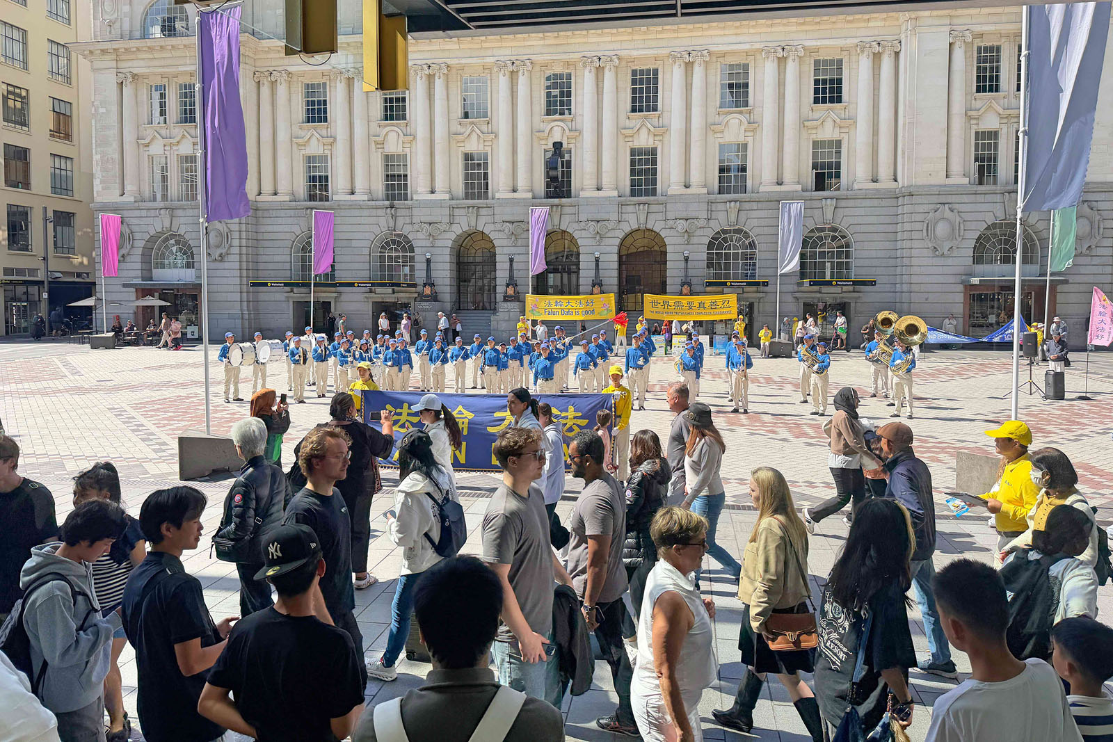 (Minghui.org) Practitioners held activities at Commercial Bay in Auckland on March 21, 2026, to introduce Falun Dafa to the public. The Tian Guo Marching Band played and practitioners did the exercises and held a rally. They also raised awareness of the Chinese Communist Party’s (CCP) persecution.