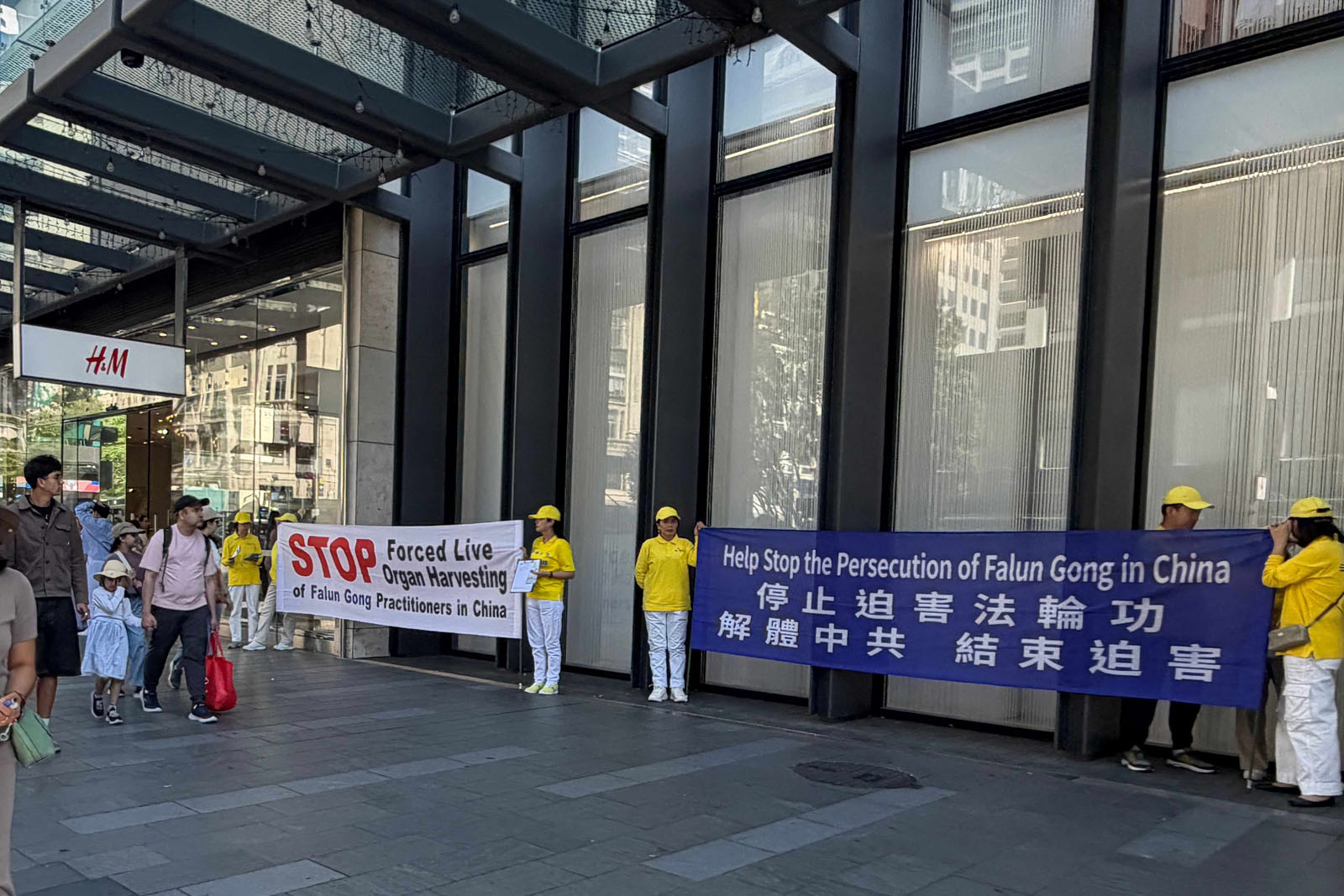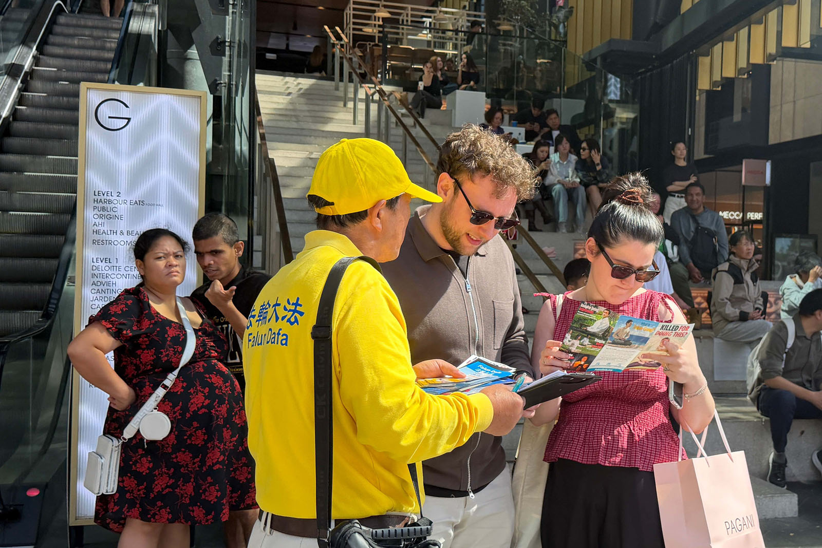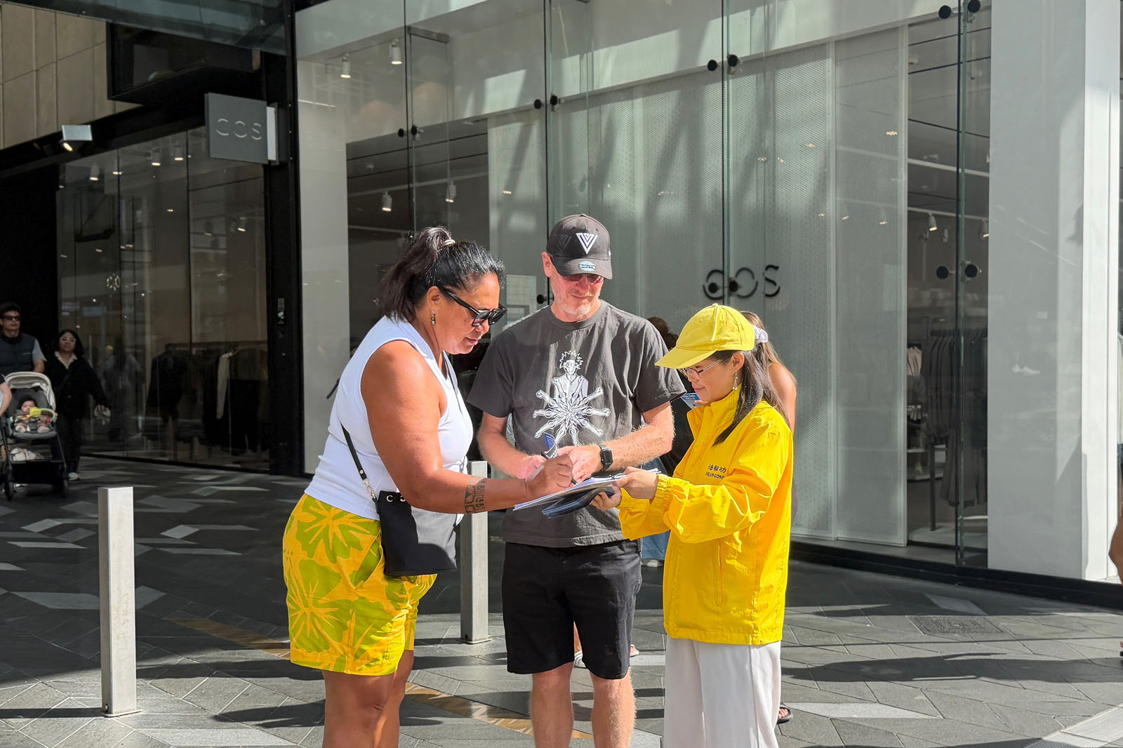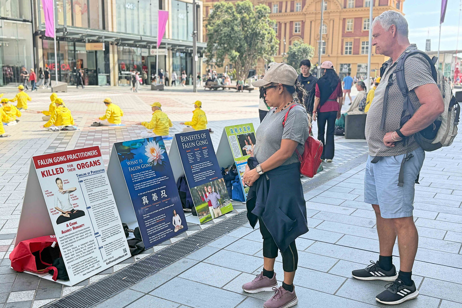 Tourists, shoppers, and other passersby paused to watch, took photos, read display boards, and talk to practitioners to learn about Falun Dafa and the benefits of practicing it. They also learned about the CCP’s persecution.