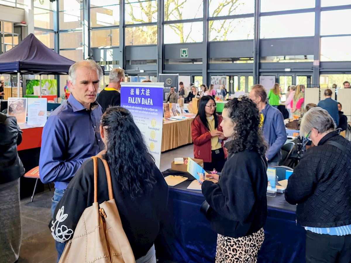 People learn about Falun Gong at the Spring Spiritual Bloom Fair in Genk, Belgium.
