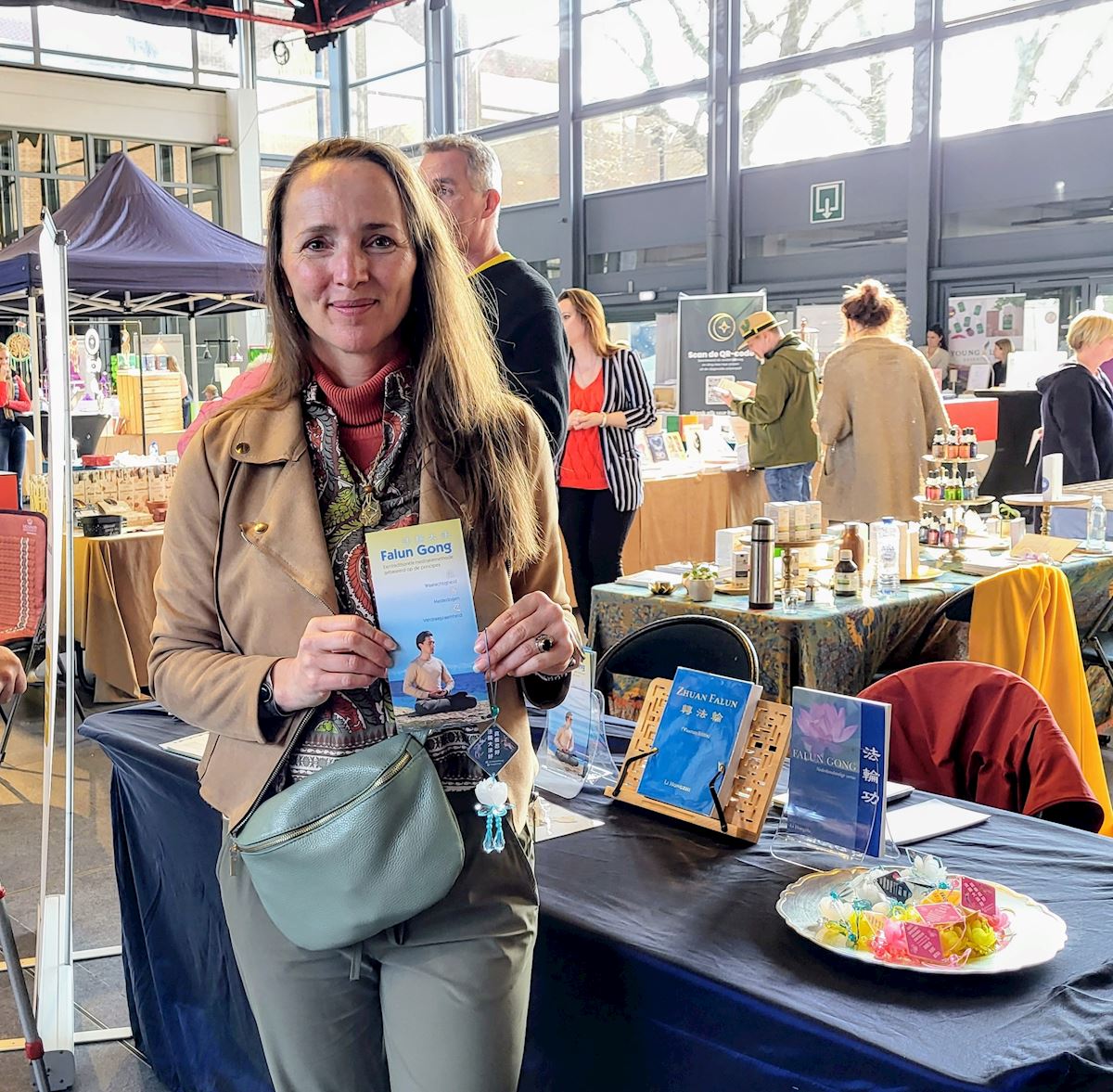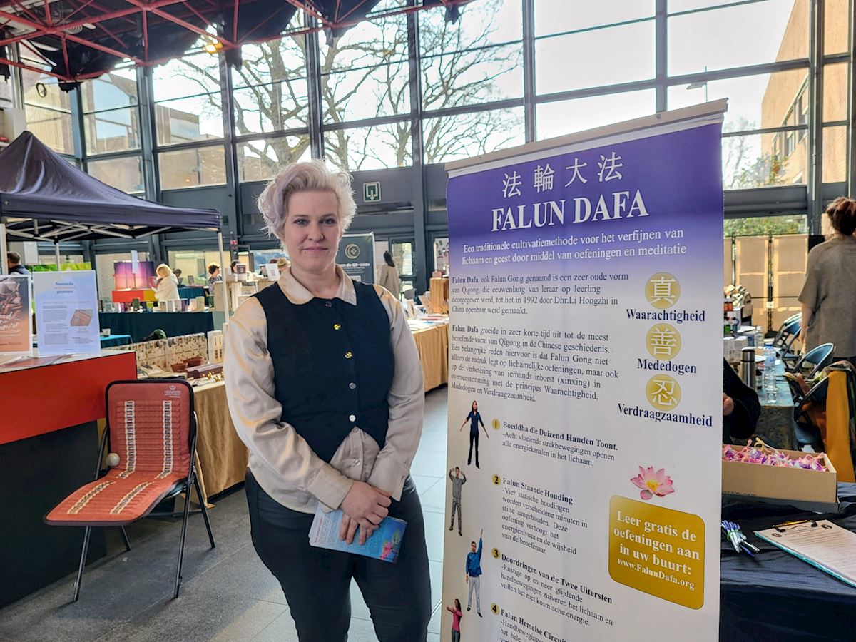 Katja owns a Chinese medicine clinic. She paused at the Falun Gong stall and talked with a practitioner because she felt meditation was connected to her professional background. The practitioner told her about Falun Gong and its principles of Truthfulness, Compassion, and Forbearance. Katja said she agreed with these values and wanted to learn more.