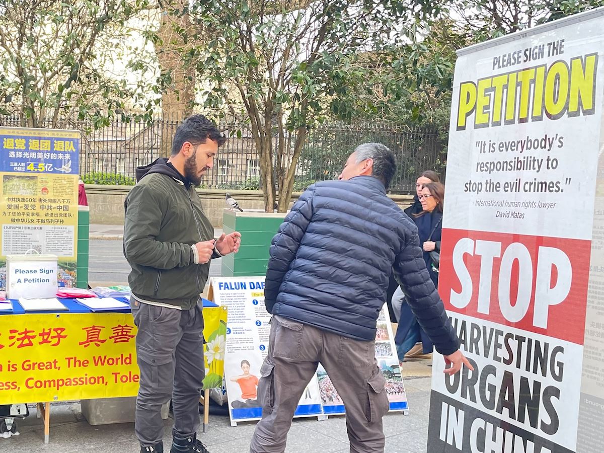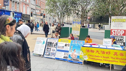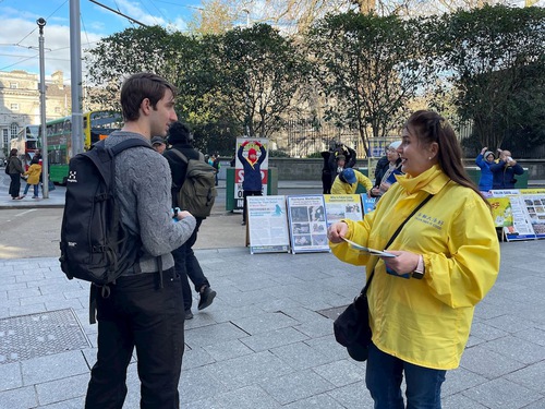 Dublin’s city center is a major draw for tourists. Every weekend in February and March, Falun Gong practitioners held activities there to introduce the practice and expose the ongoing persecution in China. Via flyers, poster displays, and collecting signatures on a petition, they expose the Chinese Communist Party’s (CCP) brutal persecution of Falun Gong practitioners including the regime’s forced organ harvesting of prisoners of conscience. Many people stop to watch the Falun Gong exercise demonstrations and sign the petition that calls for an end to the persecution.