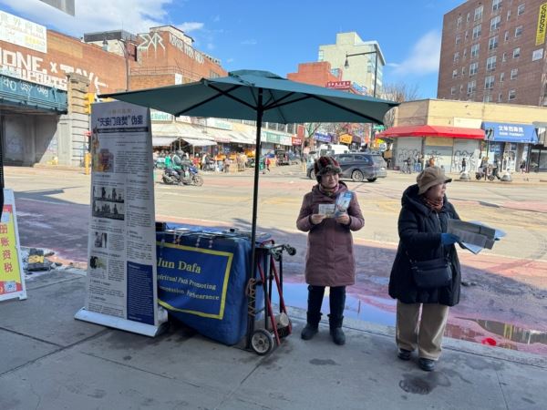 Practitioners in New York set up five booths on Main St. in Flushing, one of the city’s largest Chinese communities, to tell people about Falun Gong and to refute the CCP’s hate propaganda. Regardless of the scorching heat or freezing cold, wind or rain, they continue to tell people about Falun Gong and how the CCP persecutes it.
