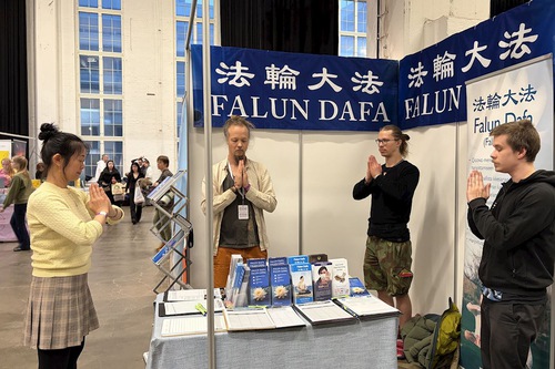 Practitioners introduced Falun Dafa, also known as Falun Gong, and told people how the Chinese Communist Party (CCP) persecutes the spiritual discipline and targets practitioners for forced organ harvesting. Practitioners demonstrated the exercises at their booth, distributed flyers, and collected signatures on a petition to stop the persecution.