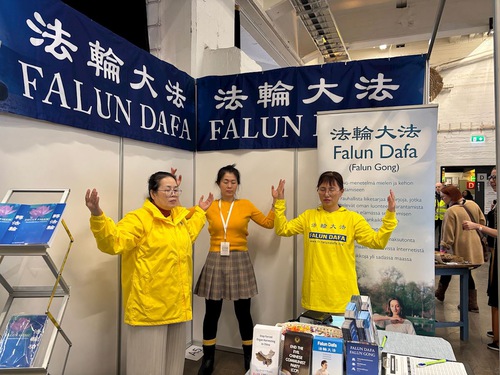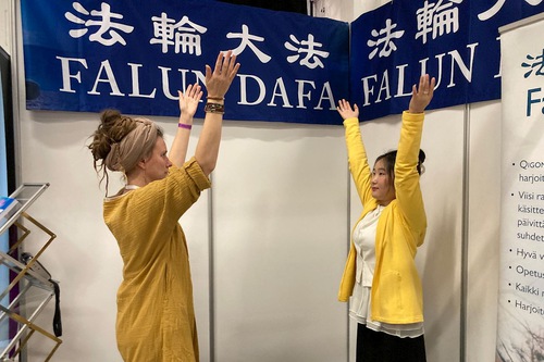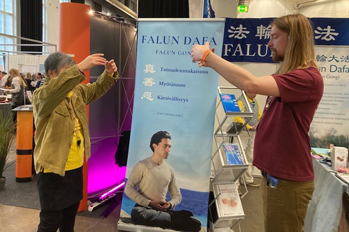 The hosting organization arranged a one-hour session for the Finnish Falun Dafa Association, and over 10 people learned the exercises. A staff member in charge of registration at the entrance was one of them. Afterwards, he said he felt energy flowing in his arms and upper body.