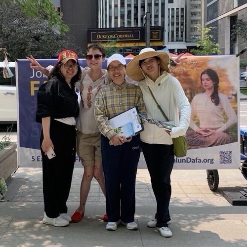 Tina said, “A woman who works at an arts center in Toronto chatted with me and said she was a Christian. I told her, ‘God is saving people, and looks at peoples’ hearts.’ She seemed to understand.” The woman told Tina that she was the coordinator of an arts group, and that her friends were willing to sign the petition to support Falun Gong. So she wrote down the names of her family and friends. Before leaving, she happily took photos with practitioners.
