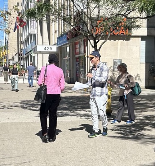 A professional working in the Toronto financial industry took one of the flyers a Falun Gong practitioner was distributing to passersby. He read it and then talked with her. He gave her his contact information and asked her to update him.