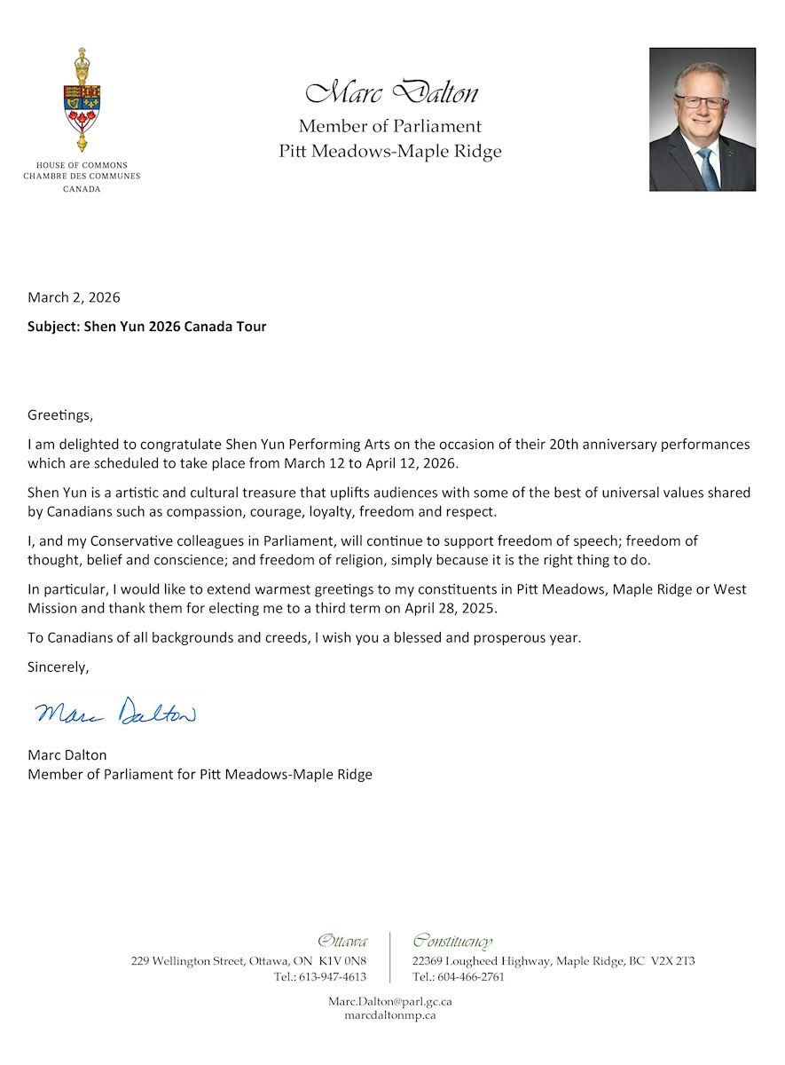 Marc Dalton, MP for Pitt Meadows-Maple Ridge wrote, “Shen Yun is an artistic and cultural treasure that uplifts audiences with some of the best of universal values shared by Canadians such as compassion, courage, loyalty, freedom and respect.”
