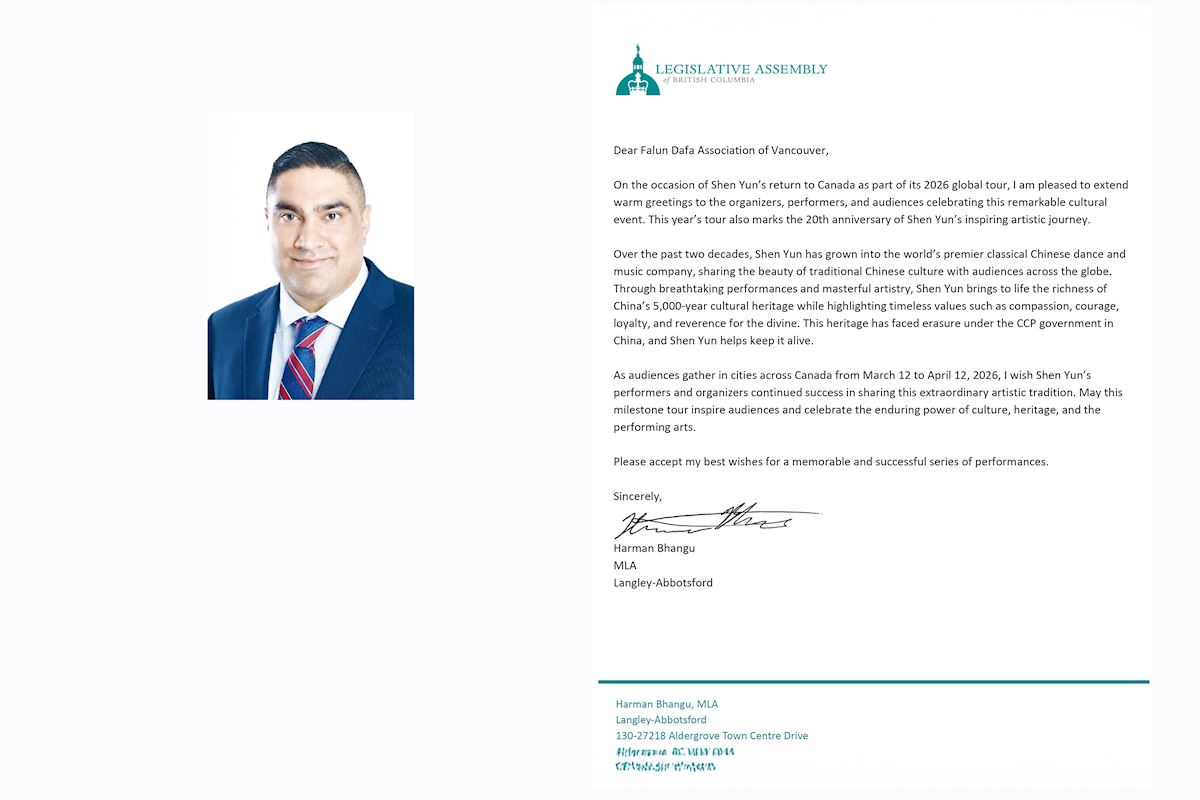 Harman Bhangu, Member of the Legislative Assembly (MLA) of British Columbia, wrote, “Over the past two decades, Shen Yun has grown into the world’s premier classical Chinese dance and music company, sharing the beauty of traditional Chinese culture with audiences across the globe. Through breathtaking performances and masterful artistry, Shen Yun brings to life the richness of China’s 5,000-year cultural heritage while highlighting timeless values such as compassion, courage, loyalty, and reverence for the divine. This heritage has faced erasure under the CCP government in China, and Shen Yun helps keep it alive.”