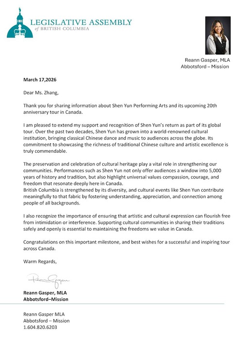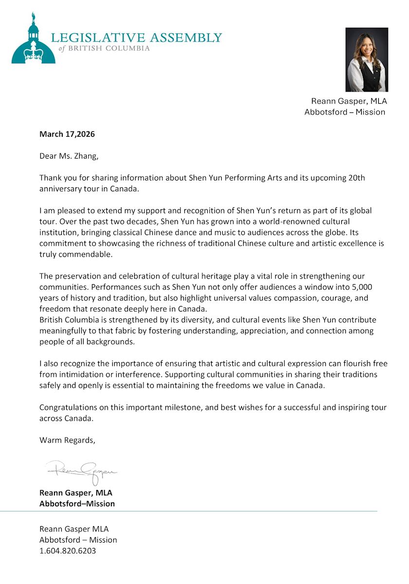 Reanne Gasper MLA of British Columbia wrote, “Over the past two decades, Shen Yun has grown into a world-renowned cultural institution, bringing classical Chinese dance and music to audiences across the globe. Its commitment to showcasing the richness of traditional Chinese culture and artistic excellence is truly commendable.”