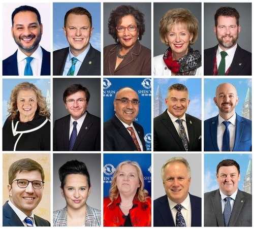 Elected officials welcome Shen Yun to Vancouver. (Screenshot courtesy Minghui.org)First row, left to right: Shuvaloy Majumdar, Member of Parliament (MP) for Alberta; Brad Vis, MP for British Columbia; Hedy Fry, MP for Vancouver Centre and Member of the Privy Council (PC); Judy Sgro, veteran MP, former Minister of Immigration, and Co-Chair of the Parliamentary Friends of Falun Gong; and Scott Reid, MP for Ontario.Second row: Anna Roberts, MP for Ontario; Costas Menegakis, MP for Ontario; Amarjeet Gill, MP for Ontario; James Bezan, MP for Manitoba; Michael Guglielmin, MP for Ontario.Third row: Garnett Genuis MP, Canada’s Shadow Minister for Employment; Melissa Lantsman MP, Deputy Leader of the Opposition; Rhonda Kirkland, MP for Ontario; Marc Dalton, MP for British Columbia; and Andrew Lawton, MP for Ontario.