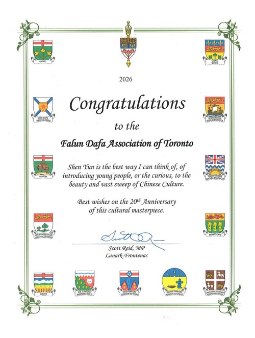 Scott Reid MP wrote, “Shen Yun is the best way I can think of, of introducing young people, or the curious, to the beauty and vast sweep of Chinese culture. Best wishes on the 20th Anniversary of this cultural masterpiece.”