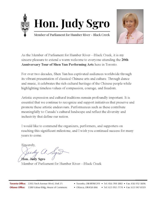 Hedy Fry MP for Vancouver Centre wrote, “Congratulations to Shen Yun on its return to Canada, as part of its annual global tours and on celebrating the 20th anniversary of its artistic journey.